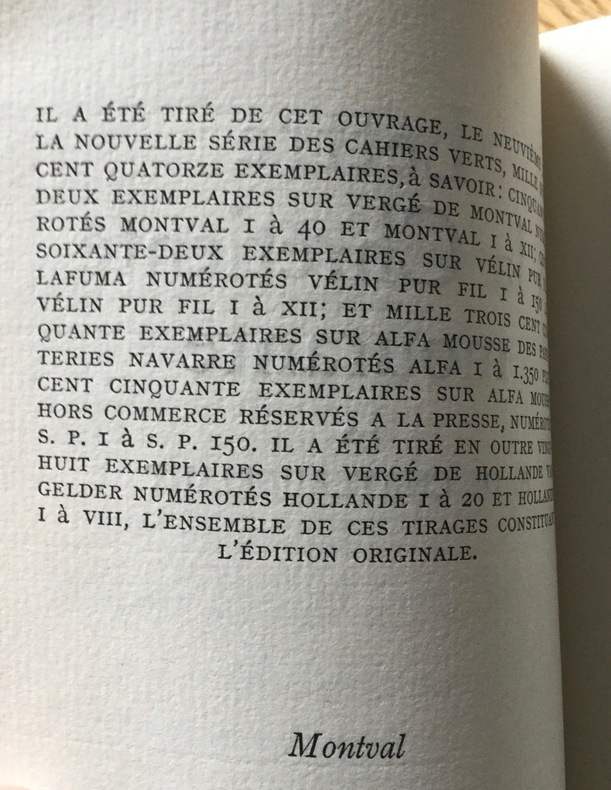 Couverture de papier vert rempliée, titre imprimé, encadré ; X+265pp ; paru dans la collection "Les cahiers verts", N°9 ; Edition originale tirée à 1714 exemplaires, celui-ci un des 1350 sur Alfa, N°822, en bonnes conditions, quelques annotations marginales au crayon