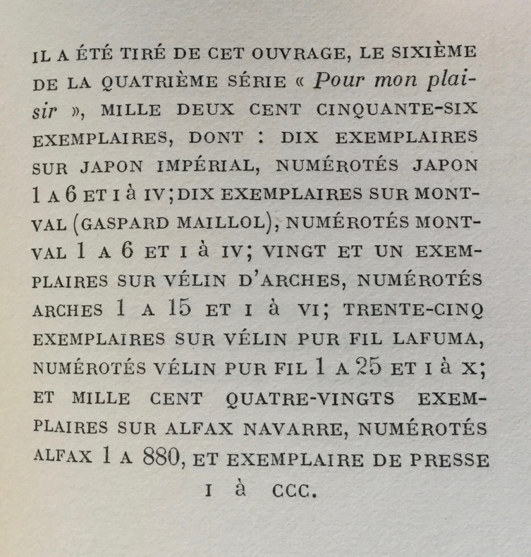 Paris Bernard Grasset 1933 In-12, broché, couverture imprimée. Chemise demi-box noir, étui.Edition originale, publiée dans la collection Pour mon plaisir. Un des 10 exemplaires numérotés sur montval Gaspard Maillol, second papier après 10 exemplaires sur japon impérial. Neuf, non coupé.