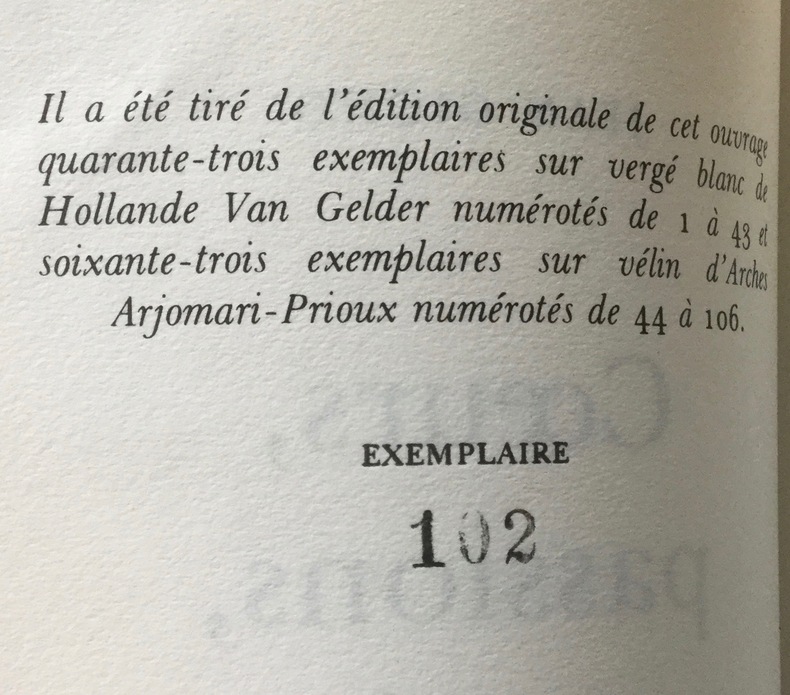 Edition originale. Un des 63 exemplaires numérotés sur vélin d'Arches (n° 58), seul tirage en grand papier après 43 ex sur vergé blanc de Hollande. Bel exemplaire. Photos sur demande.