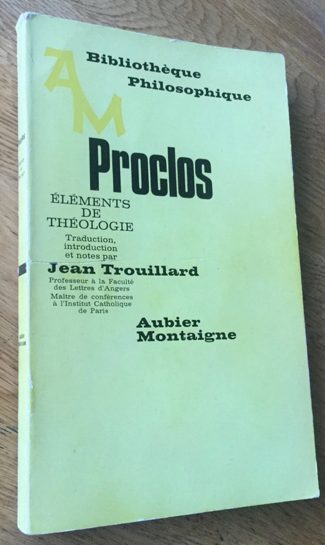 In-8 broché, Aubier / Montaigne, 1965, 196 pp. Un peu frotté, bon état général. Bon exemplaire de ce titre recherché, traduit et présenté par Jean Trouillard. (La couverture est bien jaune, mon appareil photo affadit la couleur.) Poids 250 g. Envoi lettre verte. Frais d’envoi 6,70 euros sur la France, 14,55 euros pour l’étranger (tarifs de base hors envois suivis). Possibilité de remise en mains propres sur Paris, possibilité d’envoi MONDIAL RELAY, n'hésitez pas à me contacter avant de passer commande. Twitter : @Pontneuf06.
