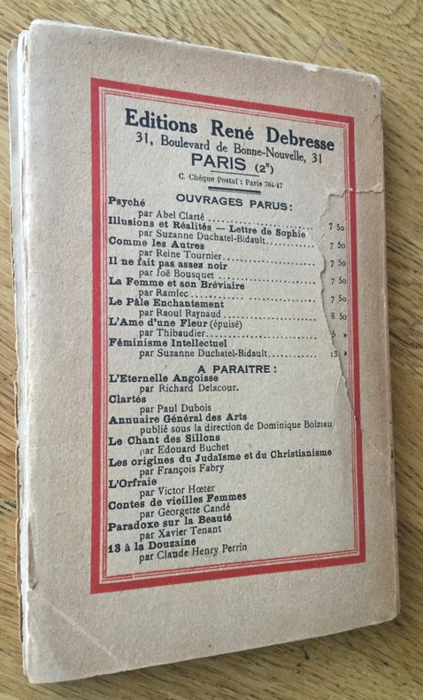 In-12 broché, Éditions René Debresse, 1932, 118 pp. Exemplaire usé et assez fragile, déchirures, notamment aux charnières, dos insolé avec manque à la coiffe supérieure, déchirure sur le quatrième plat. Exemplaire éventuellement à relier de ce très rare tirage sur pur fil d’une édition originale elle-même peu courante. Complet du bandeau et du prière d’insérer. Poids 130 g.Envoi lettre verte. Frais d'envoi 4,72 euros sur la France, 10,80 euros pour l’étranger (tarifs de base hors envois suivis). Possibilité de remise en mains propres sur Paris, possibilité d’envoi MONDIAL RELAY, n’hésitez pas à me contacter avant de passer commande. Twitter : @Pontneuf06.