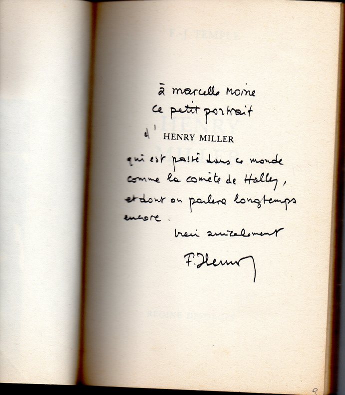 Paris, éd. Grasset, septembre 1994, Première édition en français, in-8, cartonnage souple, couv. photo en noir de Miller éd., 346 pp., traduction par Georges Belmont, notes, bibliographie, table des matières, "En 1974, alors que le {Complexe d'Icare} venait tout juste de paraître, Erica Jong a reçu une lettre enthousiaste d'Henry Miller. C'était déjà un vieux monsieur de 83 ans. Ils échangèrent une importante correspondance jusqu'à sa mort en 1980. Miller était un donneur de vie, un maître spirituel tout autant qu'un écrivain. Il avait dit un jour à Erica Jong : "Si vous vous collez à un livre sur moi, inventez tout." Et il se mit à enregistrer à son intention des heures de souvenirs, à la régaler d'anecdotes, de lettres" Très bon état