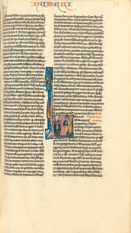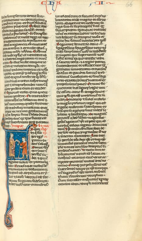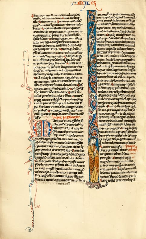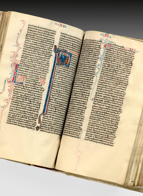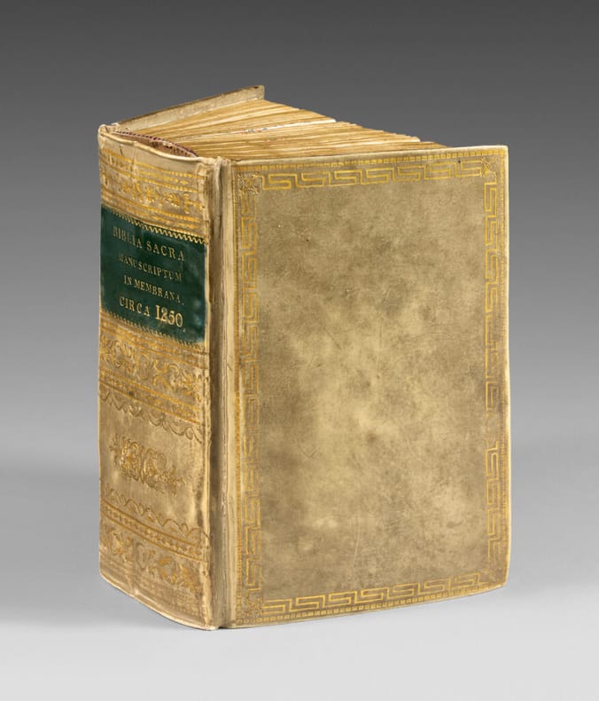 Un chef-d’œuvre de l’enluminure capétienne orné de 78 miniatures d’une finesse exquise réalisé sous le règne de Saint Louis. Bible en latin, avec le Prologue attribué à St Jérôme et l’interprétation des noms hébreux. Nord de la France, probablement Paris, 1230-1250. In-12 de 1 + 658 ff.: 1-1524, 1620, 17-2224, 2310, 24-2524, 2617 (sans le f. blanc xviii), 2726, 2828, 295 (sans le f. blanc vi). Ainsi complet. Double colonne de 47 lignes écrites à l’encre brune dans une très fine écriture gothique. Justification: 92 x 60 mm. 78 initiales historiées. Cahiers numérotés en chiffres romains au pied des versos des derniers ff. et signatures au pied du coin inférieur du texte sur chaque recto de la première moitié d’un cahier, rubriques en rouge, initiales en rouge, lettres des titres courants et numéros des chapitres alternativement en rouge ou bleu, initiales des chapitres sur 2 lignes alternativement en rouge ou bleu avec un décor de la couleur opposée, initiales de 5 à 7 lignes au début des prologues du même type mais avec des décors des deux couleurs ouvrant les prologues, 78 initiales historiées, la plupart ornées de feuillage et de dragons, le prolongement de 29 d’entre elles formant des bordures décorant la marge, peintes en bleu, rose, orange-rouge et jaune (qq. trous de vers ds. le premier f., atteinte à qq. titres courants, dernier f. restauré ds. la marge extérieure). Vélin rigide du XIXe siècle, encadrement d’une roulette grecque dorée autour des plats, dos lisse orné, pièce de titre de maroquin vert, tranches dorées. 140 x 93 mm.