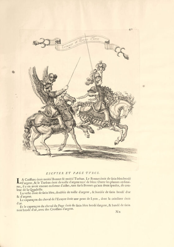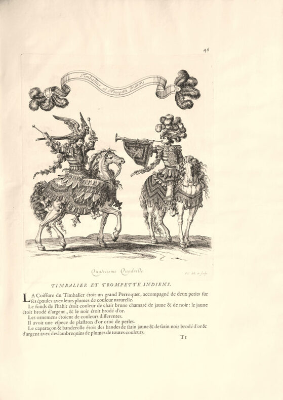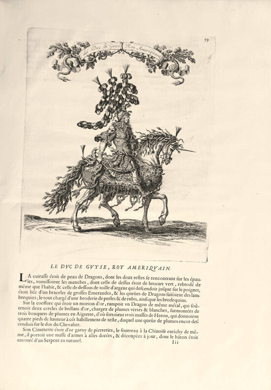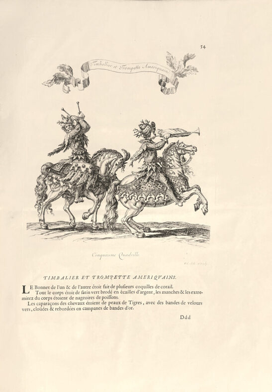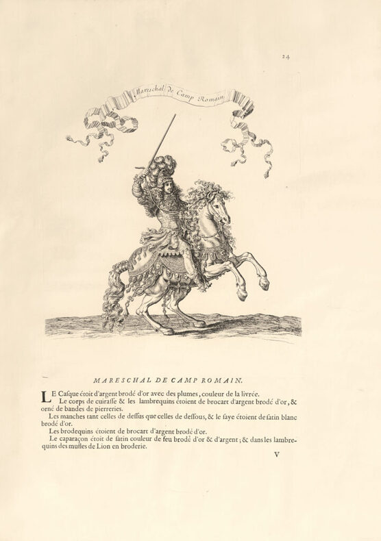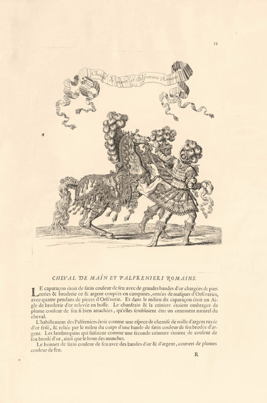 Le plus beau livre de fêtes des premières années du règne de Louis XIV. Brunet, II, 337. L’ouvrage, dont le texte est l’œuvre de Charles Perrault, avec une relation en vers latins par Fléchier, est orné de 96 estampes gravées par Chauveau, et Israël Silvestre: 30 eaux-fortes de Chauveau représentant les cavaliers des cinq quadrilles et les caparaçons de leurs chevaux, 8 eaux-fortes oblongues sur quatre feuillets doubles, 55 eaux-fortes représentant des emblèmes et devises, 3 eaux-fortes doubles d’Israël Silvestre. L’ouvrage fait partie de la collection du Cabinet du Roy. Cette collection se compose de volumes d’estampes exécutées par ordre de Louis XIV et publiés d’abord séparément, en différents formats, avec des explications imprimées. Les exemplaires publiés séparément avant la formation de cette collection, ont l’avantage de présenter les premières épreuves des planches. Les courses de testes et de bagues, ici en premier tirage, représentent les fêtes données aux Tuileries à l’occasion de la naissance du Dauphin: cinq quadrilles en costumes somptueux exécutèrent des figures de Carrousel pendant trois jours. Le Roy y est représenté en costume romain. (Histoire de l’édition française. Le Livre triomphant, planche 12). L’origine de cette fête, et par suite de ce livre, serait la réalisation d’un rêve d’enfant. «A en croire Vulson de La Colombière, les images du ‘Théatre d’honneur’, superbe volume illustré édité à Paris en 1648, émerveillèrent le petit Louis XIV, et si l’on rapproche ces images de celles que le même artiste, Chauveau, grave après la Course de bagues de 1662, il semble que cette fête n’ait été que la réalisation d’un rêve d’enfant». Très bel exemplaire en maroquin rouge de l’époque aux armes et au chiffre couronné du roi Louis XIV.
