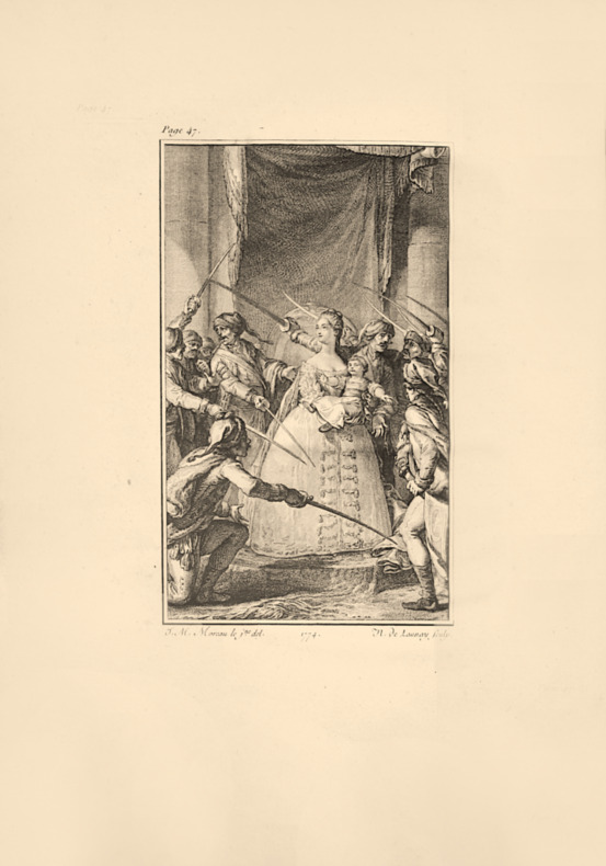 Edition originale dédicacée à la Reine Marie-Antoinette, célèbre pour le portrait de la Reine. «Un des ouvrages les plus réussis de Moreau le jeune. Contient 1 portrait de Marie-Thérèse gravé par Cathelin, d’après Ducreux, 2 portraits en médaillon gravé d’après Moreau par Gaucher en tête de la dédicace, et 4 figures par Moreau, gravées par Duclos, de Launay, Prévost et Simonet». (Cohen 412-413). L’auteur, né à Beaune (Côte-d’Or) en 1738, se fit tonsurer dans le diocèse d’Autun et devint précepteur d’une fille naturelle du comte de La Marche. Il composa pour elle un cours d’études qui devait comporter 16 volumes, mais dont 8 volumes seulement illustrés par Moreau, ont été publiés de 1772 à 1775, sous le titre Cours d’études des jeunes demoiselles. Il fut pourvu par le roi, le 25 août 1772, du prieuré de Goudargues (Gard) où il vécut désormais. Il publia encore, en 1775, Annales du règne de Marie-Thérèse, plusieurs fois réédité jusqu’en 1786. «‘Si l’on recueille, dit Mr. Fromageot, avec tant de soin les détails de ces grandes victoires, de ces conquêtes qui ont immortalisé quelques guerriers; si l’on accueille si favorablement ces histoires, qui ne présentent que le récit des batailles fameuses, dont tant de milliers d’hommes ont été les malheureuses victimes; de quels yeux doit-on voir les annales d’une Impératrice, qui, depuis 34 ans gouverne une des plus grandes parties de l’Europe, dont tous les instants, depuis qu’elle est montée sur le trône, sont employés à faire le bonheur des différens peuples qui lui obéissent; enfin qui ne semble jouir du pouvoir souverain que pour faire des heureux? C’est sans doute l’ouvrage le plus agréable que l’on puisse offrir au public. C’est de cette idée dont nous nous sommes flattés lorsque nous avons entrepris de recueillir quelques-unes de ces grandes actions de Marie-Thérèse, qui ont rendu cette illustre Héritière de la Maison d’Autriche, l’objet de la vénération de toute l’Europe.’ Nous souscrivons très volontiers à ce jugement de l’auteur, & nous sommes assurément fort éloignés de vouloir affaiblir le mérite d’un ouvrage qui du côté des faits qu’il présente, ne peut être plus intéressant ni plus cher aux fideles sujets de Marie Thérèse, & à quiconque sait apprécier l’éclat de la vertu placée sur le thrône & devenu la source du bonheur public». (Journal historique et littéraire, vol. 35). «Une partie de l’ouvrage de M. l’Abbé Fromageot offre un tableau intéressant des vertus & des actes de bienfaisance de Marie-Thérèse, de ses réglemens, de ses institutions utiles en tout genre, soit pour réformer les abus, simplifier la perception des impôts, établir l’ordre & la discipline parmi ses troupes; soit pour animer l’Agriculture, encourager les Arts, faire fleurir le commerce, accroître la population, faire circuler l’abondance dans ses vastes Etats […]. L’auteur ne conduit ces ‘Annales’ que jusqu’en 1771. La lecture de cet ouvrage vous fera, Monsieur, le plus grand plaisir; c’est une relation attendrissante de traits admirables de bienfaisance. Heureux les Peuples, dont les Souverains ne laissent à la postérité que de pareils monumens! Il y a, de cet excellent Livre de M. l’Abbé Fromageot, quelques exemplaires imprimés in-4, dont le prix est de 12 livres broché, & 15 livres relié. L’in-8 est de 6 livres broché, & de 7 livres 10 sols relié.» (L’Année littéraire, 1775, vol. 168). Fromageot refusa de prêter serment à la Constitution et fut accusé de favoriser le fédéralisme. Arrêté le 25avril 1794, incarcéré à la citadelle de Nîmes, il fut condamné à mort le 11 juillet et exécuté le même jour. «Mentionnons encore, parmi les œuvres de cette heureuse époque, les Annales du règne de Marie-Thérèse (1775), livre dédié à la jeune reine Marie-Antoinette, dont le charmant profil gravé par Gaucher se trouve sur le feuillet de dédicace». Baron R. Portalis. Précieux exemplaire en grand papier, relié en maroquin rouge armorié de l’époque. Provenance: Nicolao de Nobili, duce Minerva, Comité Fortuna