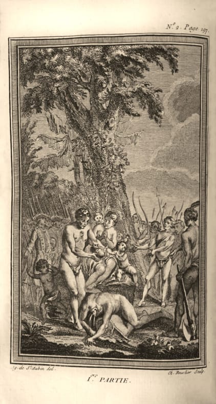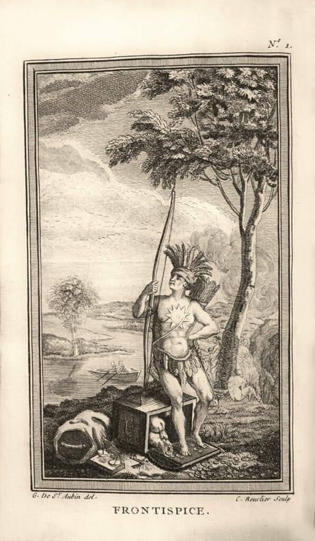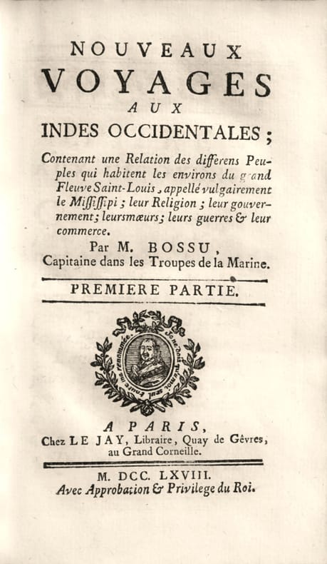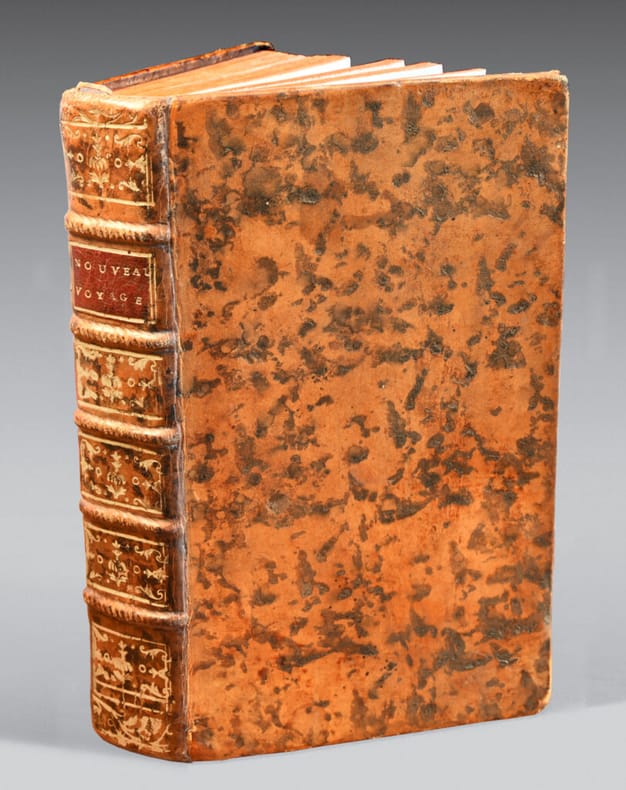 Edition originale rare illustrée de deux frontispices et de 2 planches hors texte de Saint Aubin gravées par Beurlier. Howgego I,138(B138) ; Sabin 6465 ; JCB I (III-I) 1611 ; Howes B626 ; Streeter 15187 ; Clark, Old South II, 5 ; Field 156 ; Rader 408 ; Monaghan 261 ; Hubach p. 13 ; Storm, De Graff 361 ; Eberstadt 131:84 ; Siebert 677 ; Leclerc I, 185. Cf. Servies, Florida 491 : the English edition of 1771. « Le Chevalier Bossu est un de ceux qui ont le mieux fait connaître la Louisiane, et les peuples sauvages qui l'habitaient. Il fut envoyé dans ce pays en 1750, et nommé à cette époque Capitaine de la Marine... » (Chadenat 23). First edition, of primary interest for Louisiana, Alabama, Illinois, and West Florida. Jean Bernard Bossu (1720-1792), a captain in the French navy, was the first to write about eighteenth-century Louisiana in detail and based on personal experience. He provided the French public with the earliest trustworthy description of the people and conditions in the colony. The work is actually a collection of 21 letters he wrote during his first two voyages to the country, in 1751-57 and 1757-62. Bossu traveled as far north as Fort de Chartres, just south of Saint Louis. He spent time with the Natchez, Arkansas, Koakias (Cherokees?), Alabama, Choctaw, Illinois and Atakapa tribes, providing substantial information on their habits in religion, warfare, social customs (e.g.punishment for adultery), hunting, and more. He also comments on Santo Domingo, mining, Syphilis, Havana, New Orleans, Hernando de Soto, El Dorado, the Sieur de La Salle, Granada, Jamaica, Lake Ponchartrain, Mobile and the Fountain of Youth. Occasionally he ranges even further afield, describing the skeletons of elephants (i.e., mastodons) found in the Ohio Valley in 1735 (p. 206). At second hand, he reports on events in Canada such as the capture by Montcalm of Fort Oswego, Fort Ontario and New Fort Oswego in 1756. In Book Il, Lettre XXI, Bossu speculates that the lndians reached America via a land bridge from Tartary, referring to the works of Diodorus Siculus, Peter Martyr, Lafitau, Lescarbot, and Bering. In the course of his travels Bossu was shipwrecked, had a close escape from a crocodile, and ran afoul of English corsairs several times. The four engravings by Gabriel de Saint Aubin all show Indians; among them are a gruesome decapitation and an Indian who stands on an overturned chest full of coins. The first edition of this work is distinguished from the second edition, with the same imprint and date, by its lack of the words "second edition" on the title. Howes notes, "For comments too critical of the ministry, Bossu was imprisoned and his book banned for a while in France ; this probably accounts for the scarcity of the first edition, of which Sabin found no record." The Nouveaux voyages was soon translated to English, Dutch, Germain, and Russian. Bel exemplaire en reliure de l’époque.