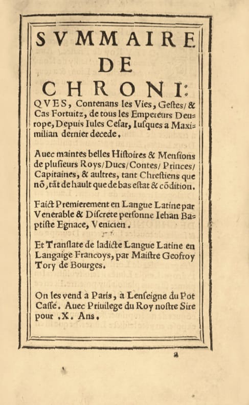 [video width="1920" height="1080" mp4="https://www.camillesourget.com/wp-content/uploads/2025/06/IMG_49791.mp4"][/video] Edition originale précieuse et rare de l’un des deux seuls livres de langue française imprimés et traduits par Geofroy Tory (1480-1533), premier imprimeur du roi François Ier, écrivain, graveur et peintre. Elle précède de quinze jours la parution du Champfleury (28 avril 1529). «Volume très rare dont M. Auguste Bernard (dans ses intéressantes recherches sur Geofroy Tory) ne signale qu’un autre exemplaire dans la bibliothèque de M. Ambr. Firmin Didot.» (J. Techener. Cat. Felix Solar. Paris, 1860). «Une des productions rares de Tory» (A. Firmin Didot. Paris, 1878). «Le seul exemplaire que j’ai vu de cette première édition, possédé par M. Ambroise Firmin Didot…» (Auguste Bernard. Bibliographie de Geofroy Tory - Paris, 1865). «Volume rare, dont un exemplaire relié en maroquin rouge par Trautz-Bauzonnet a été vendu 142 fr. F OR. Solar, ce qui est un prix exorbitant» (Brunet). A la même vente Solar (Paris, 1860), le bel exemplaire de la première édition du Champfleury du même Geofroy Tory, Paris, 1529, se vendait 152 F OR (valeur actuelle plus de 100000 €). N°613 du catalogue Solar. «Geofroy Tory, de Bourges, auquel M. Aug. Bernard a consacré une excellente monographie (voir la colonne 898 du présent volume), s’est rendu célèbre à plus d’un titre… Cependant malgré leur mérite réel, les admirables productions de cet artiste semblaient avoir été presque généralement méconnues; et c’est seulement de nos jours qu’on a su les bien apprécier. Aujourd’hui les curieux les recherchent avec le plus grand empressement et les payent, pour ainsi dire, au poids de l’or». (Brunet, année 1865). « Geofroy Tory, ce grand artiste qui paraît avoir été universel, comme les hommes de génie de son époque, était versé dans les littératures grecque, latine et même hébraïque. Il fut un des propagateurs les plus zélés de la langue française, dont il réforma l’orthographe. Il abandonna le professorat pour apprendre l’art de l’imprimerie, auquel il devait plus tard tracer des règles. Ses talents d‘artiste de littérateur et de typographe lui méritèrent de François Ier (en 1529) le titre d’imprimeur royal, titre qui fut transmis ensuite à Néobar pour le grec, à Robert et à Charles Estienne pour le latin et l’hébreu, à Olivier Mallard, successeur de Tory, pour le français, et à Denys Janot pour la même langue» (A. Firmin Didot). Geofroy Tory s’est aussi rendu célèbre par son «Champfleury» paru la même année 1529, ouvrage infiniment moins rare que celui étudié ici. Ses Livres d’Heures sont particulièrement recherchés; mais deux seules œuvres virent le jour pour lesquelles Tory fut à la fois imprimeur et traducteur et donc, dans la conception du XVIè siècle, auteur: le présent volume, imprimé en 1529 et «les Politiques de Plutarque» imprimé en 1532. Dans l’épitre imprimée en tête du volume, Geofroy Tory écrit en forme de préface. Geofroy Tory de Bourges a tous studieux et vrays amateurs dhonneste lecture et fructueux passe temps dit et donne humblement salut. Ie vous avois promis nagueres, au preface de la Table de Cebes et des Trente dialogues nouveaulx de Lucian, quen bref de mes petits labeurs je vous ferois quelque aultre nouveau livre, qui a mon advis vous pourroit donner quelque bon et gracieulx passe temps, en vous y esbatant a lire et veoir choses desquelles vostre esperit pourroit en temps et lieu estre recree et savoureusement soulace. A ceste fois cy (mes tres honorables seigneurs), comme vostre petit serviteur, qui vous est totallement desdie, ie vous fayz present dun Summaire de Chroniques, que je vous ay translate, comme les susdictz Cebes et Dialogues, de langue latine en langaige francoys, au moins mal quil ma este possible, vous advertissant que, a la maniere de Jehan Baptiste Egnace, present autheur, ie ny ay meu : ne change le sens de lhistoire en faveur dhomme quelconque. Ma traduction aussi ny est de mot a mot, car ce eust este stille trop mesgre et sans grace aucune. Ie scay, selon Horace, que (nec verbo verbum curabit reddere fidus interpres) ung translateur ne se doibt soucier de rendre ne adresser ung chacun mot de ce quil traduit a aultre mot de son langaige ; mais doibt bien maintenir le sens, et le coucher en plus beau stille qui luy sera possible. Ainsi ay ie faict au mieulx que iay peu, tant pour lamour et honneur que ie vous doibs, que pour ne desvoyer de la pure vente de lhistoire, qui est de telle nature, qu'elle ne veult aucunement estre alienee de sa purite. Marc Tulles Cicero nous la bien enseigne, quant il nous a laisse par escript, au second livre de son Orateur, ou il a dit : « Nam quis nescit primam esse historiae legem, ne quid falsi dicere audeat, deinde ne quid veri non audeat, ne qua suspitio gratiae sit in scribendo, ne qua simulatis ? » Mais qui esse (dit il) qui ne scayt que la premiere loy dhistoire est de ne oser dire chose faulce, et de ne se faindre a dire la verite, afin quil ny aye aucune suspition de faveur ou envye en ce quon escript ? Certainement histoire doibt estre purement vraye, tant pour les causes ia dictes, que pour ce que, comme ledict Ciceron a recite ung peu devant le ia dict lieu allegue: « Historia est testis temporum, lux veritatis, vita memoriae, magistra vitae, et nuncia vetustatis.» Histoire (dit il) est tesmoignage des temps, lumiere de verite, nourice et vie de la memoire, enseigneresse et maistresse deschole a nostre vie, et messagiere danciennete. Ie vous ay voulentiers plustost choisi faire present dune histoire, et icelle abregee en summaire, que dautre chose, pour ce quen vous y recreant vous y puissiez veoir, comme en ung mirouer, mille excellentes choses, desquelles pourrez cognoistre et entendre innumerables bons advertissemens pour vous faire service quelque foys en temps et lieu.