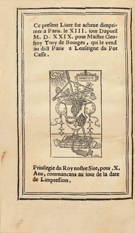 Précieux exemplaire conservé dans son vélin du XVIIe siècle. On les vend a Paris, a Lenseigne du Pot cassé. (à la fin): Ce present Livre fust acheve dimprimer a Paris le XIII. Iour dapvril M.DXXIX, pour Maistre Geofroy Tory de Bourges, qui le vend au dict Paris a Lenseigne du Pot casse (13 avril 1529). Petit in-8, contenant (16) ff. préliminaires, 99 ff. de texte et (13) ff de table, lettres rondes, marque au pot cassé au dernier feuillet, l’ensemble du texte est imprimé au sein d’un triple encadrement de filets. Plein vélin ivoire, dos lisse, titre et date calligraphiés à l’encre brune, infime galerie de vers en marge intérieure d’une vingtaine de ff. sans atteinte au texte, taches d’encre sur 2 ff., garde finale renouvelée. Reliure du XVIIe siècle. 161 x 103 mm.