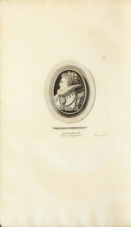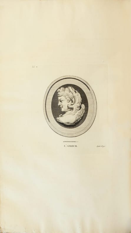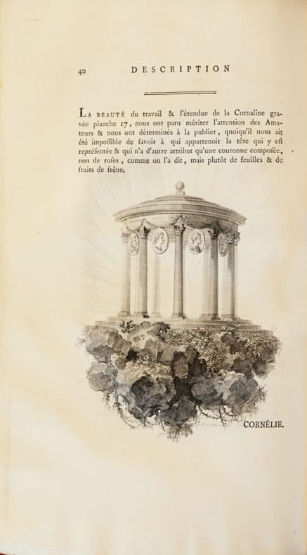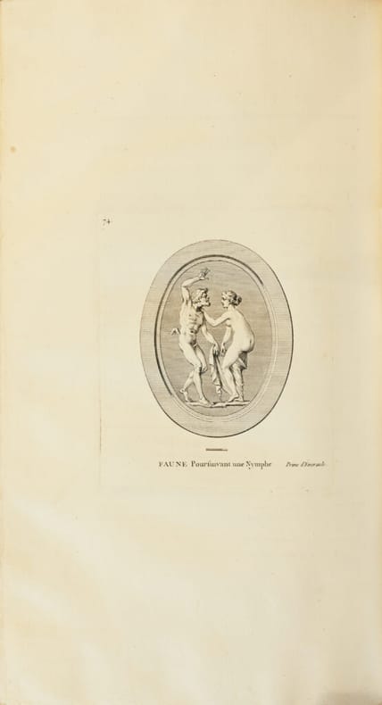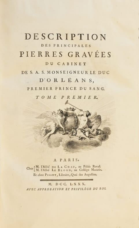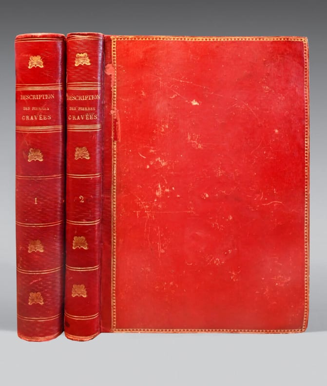Edition originale et exemplaire de luxe de premier tirage, l’un des rares imprimés sur grand papier de hollande signalé par Brunet. Cohen 543, Brunet, III, 727. «Lachau (L’Abbé Geraud de), bibliothécaire, secrétaire interprète et garde du cabinet des pierres gravées du duc d’Orléans a publié avec l’abbé Leblond, son ami, le deuxième volume de la Description des principales pierres gravées du cabinet du duc d’Orléans, Paris, 1784, petit in-folio; l’abbé Arnaud est l’auteur du premier volume de cette ouvrage, le plus beau qui eût encore paru dans ce genre. Il y en a des exemplaires en grand papier de Hollande.» (Michaud). Toutes les pierres décrites dans cet ouvrage, acquises en 1741 et vendues par la suite à Catherine II, sont illustrées d'une planche et accompagnées d'explicationsérudites avec de nombreux renvois aux textes antiques. «En tout cas superbe frontispice par Cochin, gravé par Saint-Aubin, renfermant le portrait du duc d’Orléans; 1 fleuron, le même pour les deux titres, par Saint-Aubin; 2 très jolies vignettes, en tête du 1er volume et du 2ème dessinées par Cochin et A. de Saint-Aubin, gravées par Saint-Aubin; 179 pierres gravées par Saint-Aubin, quoique non signées, et 55 culs-de-lampe, la plupart d’une grande beauté (46 dans le 1er volume et 9 dans le 2ème) tous dessinés et gravés par Saint-Aubin, à l’exception du dernier du 1er volume, gravé par Mme E. de Sabran. Les pierres gravées ont des numéros de 1 à 97 dans le premier volume; les n° 35 et 39 ont trois planches et le n° 78 en a deux, et de 1 à 76 pour le second, le n° 2 ayant deux planches». (Cohen) Sept planches de médailles spintriennes contenant 37 sujets, dessinés et gravés par Saint-Aubin ont été tirées ensuite et ajoutées à certains exemplaires. En conséquence, Cohen mentionne qu’«il est à observer que fort peu des exemplaires en reliure ancienne contenaient à l’origine les planches spintriennes». «Un superbe exemplaire relié en maroquin rouge par Derome, formé par Le Blond, l’un des auteurs, tiré sur papier de choix, composé d’épreuves de tout premier tirage et contenant 3 planches découvertes et plusieurs culs-de-lampe spintriens, vendu 3100 F. Or (un livre de bibliophilie se négociait alors à compter de 5 F. Or), vente Beckford (I, n. 2464), est aujourd’hui chez M. Henri Béraldi.» (Cohen). Précieux exemplaire appartenant au tirage de luxe sur grand papier de Hollande conservé dans sa belle reliure de l’époque en demi-maroquin rouge.