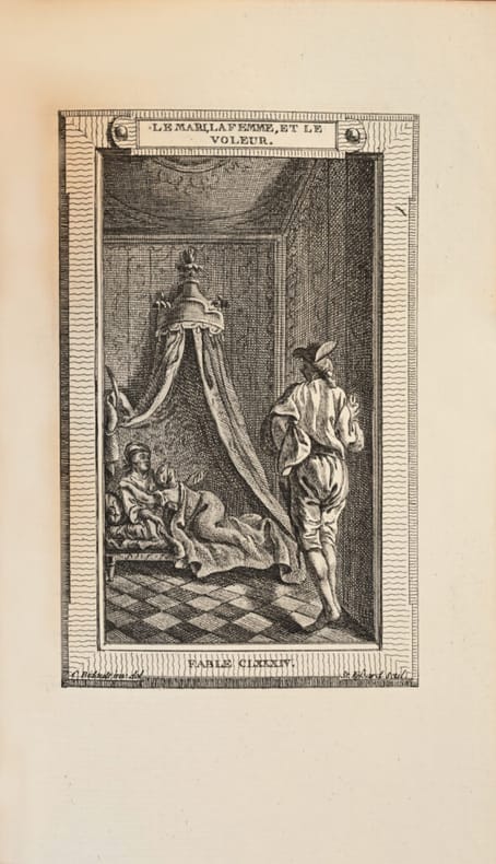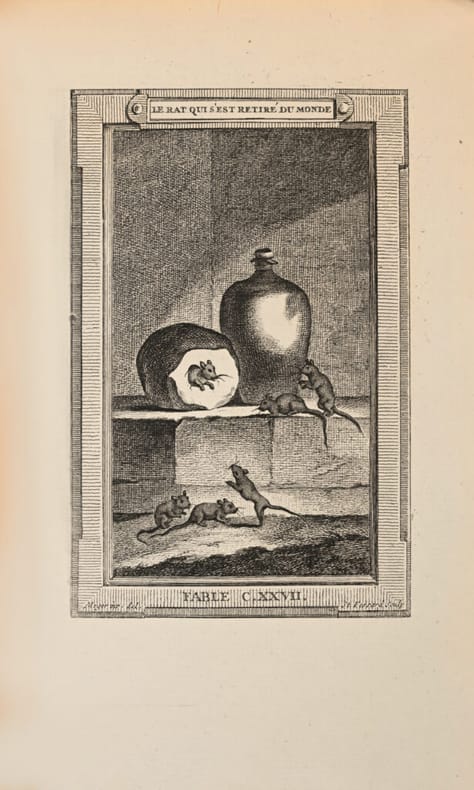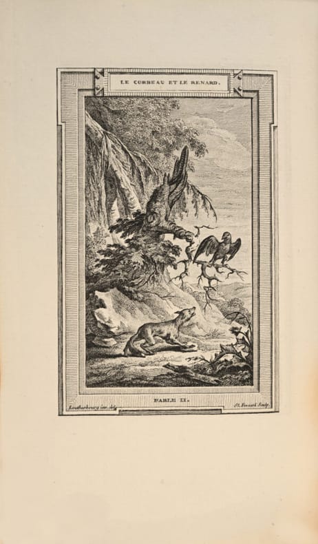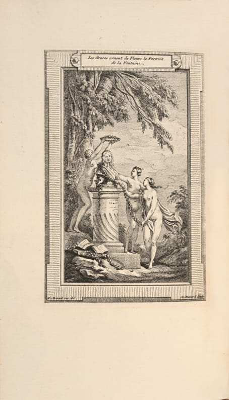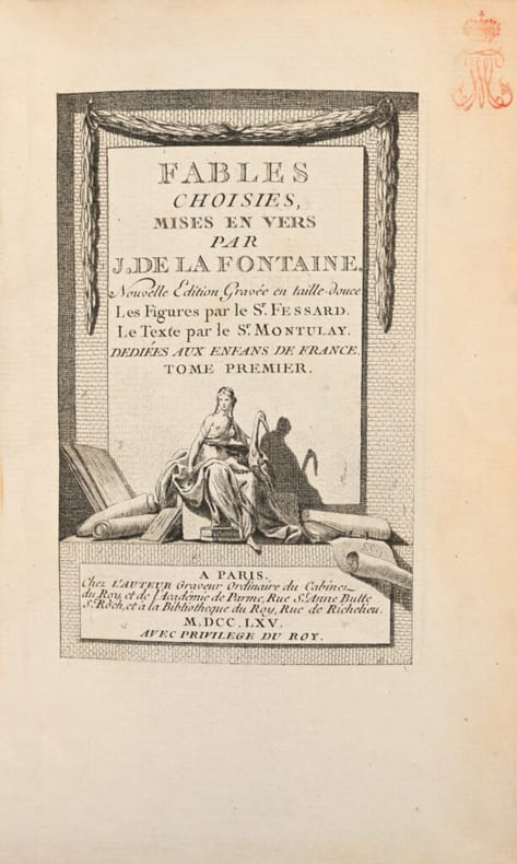Premier tirage de l’une des plus belles éditions anciennes des Fables de La Fontaine. Cohen, Guide de l’amateur de livres à gravures du XVIIIe siècle, col. 551 et 552. Elle est ornée de 243 estampes, 243 vignettes, 226 culs-de-lampe, 6 titres gravés et 1 frontispice par Bardin, Bidault, Caresme, Dessais, Houë, Kobell, Leclère, Leprince, Loutherbourg, Meyer et Monnet. Le texte est entièrement gravé par Montulay et Drouët. «Le Sr Fessard graveur ordinaire du Cabinet du Roy a entrepris de graver les “Fables de La Fontaine” avec des estampes en 6 volumes in-8. Il en a donné 5 volumes au public, le sixième est sur le point de paroître. Il est dans l’usage de présenter un exemplaire de chaque volume aux princes et princesses de la famille Royale, on lui a payé en conséquence à titre d’indemnité une somme de six cents livres sur le trésor royal lors de la distribution de chacun des 5 premiers volumes. Il supplie Sa Majesté de lui accorder la même somme de six cents livres pour le sixième et dernier volume qu’il va présenter. Et Louis XVI eut la bienveillance d’accorder la demande et de mettre le mot “bon” de sa main.» Baron Roger Portalis, Les graveurs du XVIIIe siècle. Précieux exemplaire de Béatrix de Choiseul-Stainville, duchesse de Gramont, «l’altière et impérieuse» sœur du duc de Choiseul, ministre de Louis XV. Elle mourut décapitée le 17 avril 1794. «En dehors d’éminentes qualités qui appartiennent à l’Histoire, son goût pour les choses de l’art et le soin éclairé qu’elle apporta dans la composition de sa belle bibliothèque, la désignent encore à l’attention des curieux et des lettrés. Les livres de la duchesse de Gramont sont reliés simplement, mais avec une certaine élégance. Ils se recommandent surtout par la qualité exceptionnelle du maroquin dont la couleur a résisté à l’action incisive du temps. Le soin avec lequel a été exécuté le corps d’ouvrage justifie l’empressement dont ils sont l’objet de la part des bibliophiles». Quentin Bauchart, Les Femmes Bibliophiles de France. L’un des grands livres classiques illustrés du XVIIIe siècle, très rare en maroquin armorié du temps.