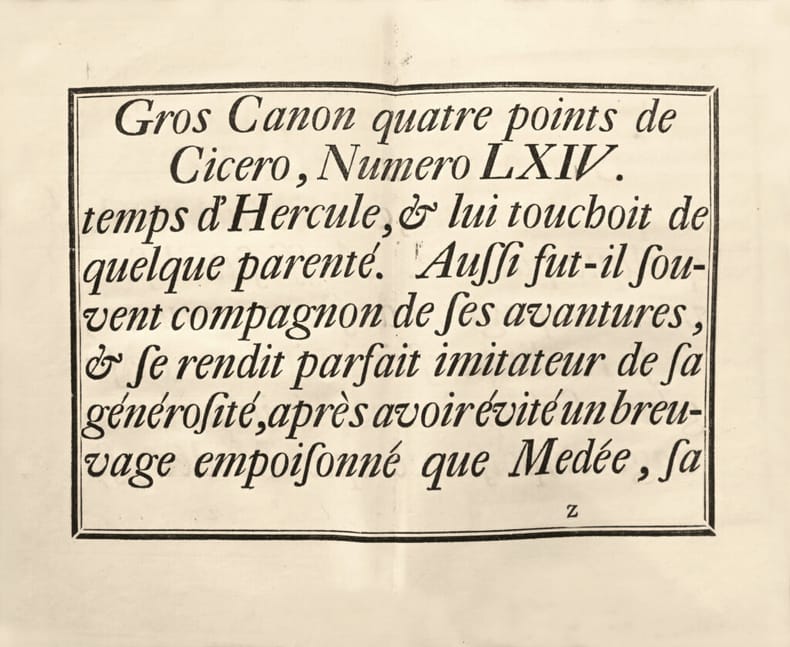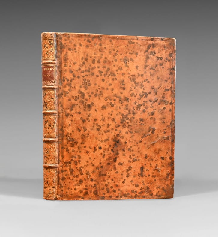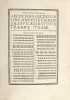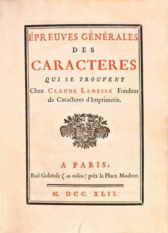 Edition originale de ce précieux ouvrage qui «présente mieux que nul autre la production des graveurs de caractères en France dans le dernier quart du XVIIe s et la première moitié du XVIIIe» (Updike). Audin, 27 ; Birrell and Garnett, 35 ; Bigmore and Wyman 1, p. 417 ; Cat. Berlin, 5394 ; F. Johnson, The Type Specimen of Claude Lamesle (1927); Jammes, Collection de specimen de caractères, n°19 ; D.B. Updike, I, p. 270 : « This book, both in type and ornaments, I think presents better than any other, the output of French foundries during the last quarter of the XVIIth and the first half of the XVIIIth century. The collection of types is remarkably fine ». Rare première édition de ces épreuves dont il existe une nouvelle émission publiée par Nicolas Gando en 1758. Précieux catalogue de la typographie au XVIIIe siècle qui donne tous les caractères les plus élégants fondus depuis le siècle précédent jusqu'en 1742. « Lamesle avait acheté en 1737 l'ancienne fonderie de Jean Cot qui possédait des caractères de Garamont ou de ses imitateurs, de Robert Granjon, de Jean Jannon qui ont connu une large diffusion à travers l'Europe. En 1758, ayant vendu son établissement, Lamesle partit pour Avignon où il créa une nouvelle fonderie. Parmi les caractères proposés dans ce volume figure un « Cicero gros oeil » de Robert Granjon que l'on reconnait dans les inventaires de Plantin. On peut aussi noter la présence d'un autre Cicero, dit « La Police » qui avait servi à imprimer en 1705, le Traité de la Police de Nicolas de La Mare. Ce carctère qui comportait certaines carctéristiques des « Romains du Roi » avait été gravé par Mathieu Malherbe Des Portes dont le nom figure dans un document manuscrit de la main de Fournier le Jeune publié apr Mme Jeanne Veyrin-Forrer dans La Lettre et le Texte » (Jammes). Lamesle, qui avait repris la fonderie de Jean Cot en 1737, entra ainsi en possession de deux caractères gravés par Grangeon au XVIe s.: le Cicero Gros Œuf n° XXXIV et le «Petit Parangon» n° LI. II possédait aussi le Romain du Roi de l'imprimerie Royale dont le fils de Jean Cot avait fait une copie subreptice. Les caractères sont accompagnés d'initiales et de très nombreux ornements. Lamesle possédait également des caractères arabes, hébraïques et d’autres destinés à imprimer de la musique. L’ouvrage présente ainsi 72 spécimens de caractères d'écriture et 12 de musique. Les feuillets dépliants sont consacrés aux gros corps et à la musique. Le titre et la musique gravée sont imprimés en rouge et noir. Bel exemplaire conservé dans une jolie reliure de l'époque, condition exceptionnelle pour un ouvrage de ce genre.