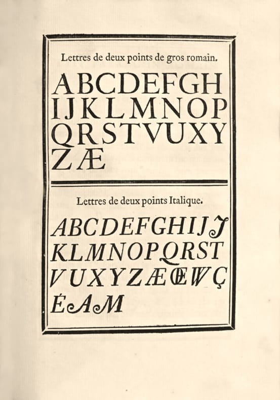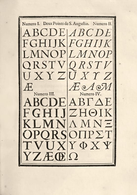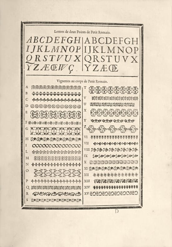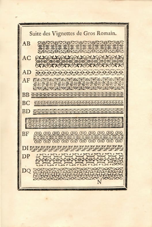 Edition originale de ce précieux ouvrage. A Paris, Ruë Galande (au milieu) près la Place Maubert, 1742. Petit in-4 de (2) ff. bl., 1 feuillet titre imprimé en rouge et noir, 80 planches de spécimens dont 10 à double-page montées sur onglet. Veau havane granité, triple filet à froid entourant les plats, dos à nerfs orné de motifs floraux et de filets dorés, pièce de titre en maroquin rouge, roulette dorée sur les coupes, tranches rouges. Reliure de l’époque. 219 x 160 mm.