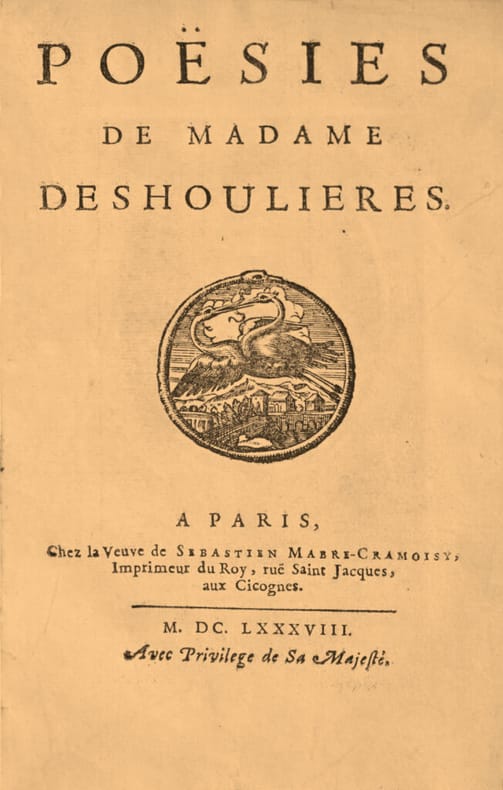Edition originale de la plus extrême rareté, publiée par l’auteur, reliée en maroquin ancien, des poésies de Madame Deshoulières, l’une des célèbres «Précieuses». Douée de toutes les qualités du corps et de l’esprit, elle reçut l’éducation la plus raffinée, apprit le latin, l’espagnol, l’italien, la musique, la danse, l’équitation. Elle étudia la poésie sous la direction d’un maître, Hesroult. A treize ans, selon Sainte-Beuve, à dix-huit selon d’autres historiens, elle épousa Guillaume Deshoulières, gentilhomme ordinaire de Condé, qu’il suivit dans la Fronde, s’exilant avec lui à Bruxelles. Restée à Paris, Mme Deshoulières fréquenta des érudits et de beaux esprits: Ménage, Conrart, Benserade, et écouta Gassendi dont elle fit siennes certaines théories (Bayle la cita dans son article sur Spinoza). Rejoignant son mari à Bruxelles en 1655, elle y connut des succès mondains, puis fut emprisonnée pour avoir réclamé trop vivement aux autorités flamandes la pension due à son mari. Libérée et rentrée à Paris, elle se lia avec les meilleurs écrivains et les plus grands noms de la société: Corneille, à qui elle fut toujours fidèle, son frère Thomas, Pellisson, Quinault, Fléchier, Mascaron, La Rochefoucauld, Montausier, Vivonne, Saint-Aignan, Vauban. Elle fut surtout bien reçue à l’hôtel de Bouillon et à l’hôtel de Nevers. C’est de là qu’elle suscita et dirigea la cabale contre la Phèdre de Racine. Elle tenait salon de bel esprit et restait fidèle aux admirations de sa jeunesse. Lors de la querelle des Anciens et des Modernes, elle prit tout naturellement le parti de Perrault. Somaize l’a mise dans son Dictionnaire des précieuses, sous le nom de Dioclée. Elle se fit une spécialité de la poésie pastorale et trouva le moyen de composer des idylles ou des églogues sur les événements menus ou grands de la vie de cour, ainsi des «idiles» sur la mort de Montausier, le retour du roi à la santé, la naissance de «Monsieur, duc de Bourgogne», une églogue intitulée «Louis». Dans ses églogues, ses élégies, ses épîtres, ses chansons, elle chante ses animaux familiers, son chien, sa chatte, ses moutons et ses brebis. On cite encore dans les anthologies l’églogue célèbre: «Sur les bords fleuris, Qu’arrose la Seine…». Elle a de la grâce, de l’esprit, de la mollesse, une assez vive sensibilité, une certaine naïveté. Voltaire l’admirait fort. «Elle a joui longtemps de la première place parmi les femmes poètes» écrivait Sainte-Beuve. Les œuvres de Mme Deshoulières sont souvent l’écho des jeux d’esprit de son salon, contrepoint parisien de la cour du jeune Louis XIV, que fréquentaient les deux Corneille, Tallemant, La Rochefoucault, le duc de Montausier, Bussy-Rabutin… et Perrault. «Mais c’est la veine élégiaque et pastorale héritée de l’Astrée qui fera sa fortune au XVIIIesiècle: ses églogues et ses idylles consacrent une poésie sérieuse qui prône la vie innocente et bucolique des bêtes, loin des passions des hommes que l’ambition et la cupidité ont corrompus». Cette édition originale des Poésies de l’une de nos célèbres précieuses est fort rare et a toujours été recherchée des bibliophiles, notamment les deux seuls exemplaires cités en maroquin ancien: l’exemplaire en maroquin ancien aux armes de Madame de Chamillart, 1620 F. Or (enchère colossale) à la vente du Baron Pichon et le second exemplaire relié en maroquin ancien - le présent exemplaire - vers 1730 par Anguerrand provenant de la bibliothèque du duc de La Vallière.