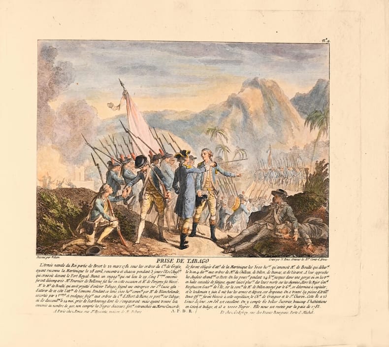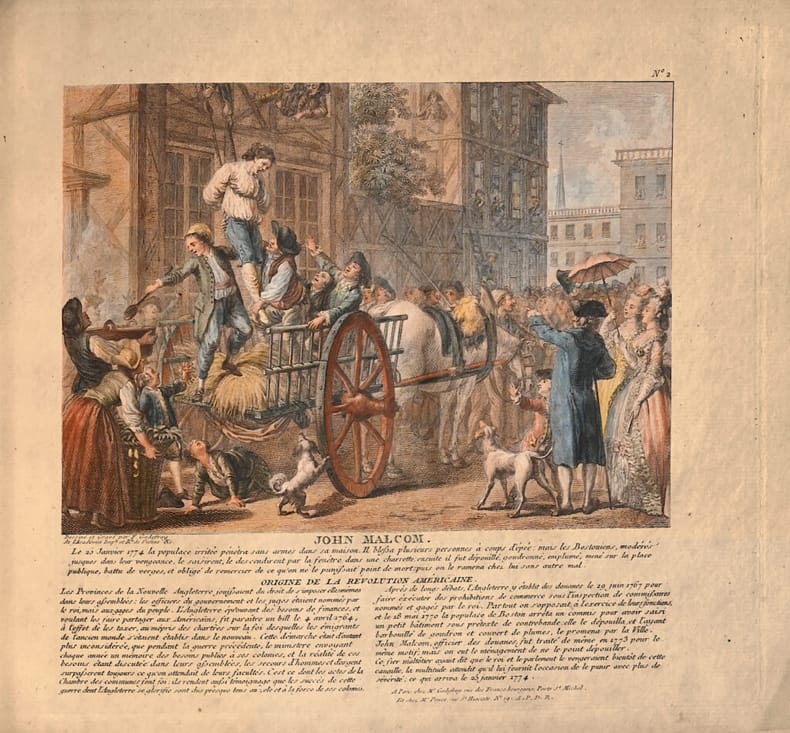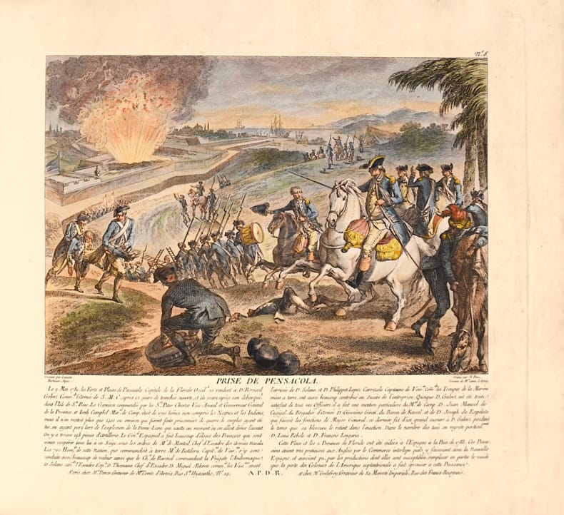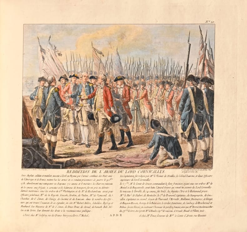 Édition originale de premier tirage de cette suite complète de 16 planches gravées retraçant les origines et les évènements marquants de la Révolution Américaine. Sabin, n°68421; Cohen, 490; Howes, C-576 ; Winsor, VI, p. 185. Recorded here are some of the major events of the War and of the larger global conflict between Great Britain and France, including the tarring and feathering of John Malcom at Boston, the battle of Lexington, the capitulation of Burgoyne at Saratoga, the capture of Dominica, Senegal, Grenada, Pensacola, and Tobago, the surrender of Cornwallis at Yorktown, the battle of St. Eustache, the siege of Fort S.Philippe, and the attack on Brimstomhill. There is also a general map of the United States and a composite map of the Gulf of Mexico, Barbary, Minorca, and Tobago. Below each view, forming part of the engraved surface is brief explanatory text by Niquet. The engraved title contains a précis of the War, surmounted by five inset views of military and naval engagements, while the final plate, decorated with four similar insets, gives a précis of the Treaty of Versailles in 1783 and a list of the principal officers killed or wounded in the war. Howes describes this as the first French book with a title-page mentioning the United States. Cet extraordinaire ouvrage sur la guerre d’indépendance des Etats-Unis d’Amérique se compose de belles fresques (180 x 235 mm) gravées par Ponce, Godefroy, Le Barbier, Marillier… illustrant les évènements marquants de la Révolution Américaine: – Titre gravé orné de cinq vignettes de combats navals et terrestres dont La défaite anglaise en Louisiane et la prise du Fort de la Mobile le 14 mars 1780. – John Malcom ou les Origines de la Révolution Américaine. – Journée de Lexington. – Sarratoga, le 17 novembre 1777. – Prise de la Dominique. – Prise du Sénégal. – Prise de l’isle de La Grenade. – Prise de Pensacola le 9 mai 1781. – Prise de Tabago. – Reddition de l’armée de Lord Cornwallis. – Surprise de St Eustache. – Siège du Fort S. Philippe le 4 février 1782. – Attaque de Brimstomhill. – Carte des Etats-Unis. – Cartes particulières. – Précis du Traité de Paix. Il s’agit du seul ouvrage contemporain des faits publié en France sur le sujet et du premier ouvrage français à évoquer les Etats-Unis sur sa page de titre. “This beautiful series of plates is often cited as the first French book on the "United States" since it used that name in the title. This work was of great influence in creating the iconographic model for the new democracy”. Superbe exemplaire de la plus grande rareté dont l’ensemble des 16 planches gravées ont été délicatement mises en couleurs à l’époque. Nos recherches nous ont permis de trouver trace d’un seul autre exemplaire en coloris de l’époque passé sur le marché depuis le début des relevés, en juin 2013, il y a 11 ans. Admirable recueil d’estampes sur la guerre d’indépendance des États-Unis d’Amérique.