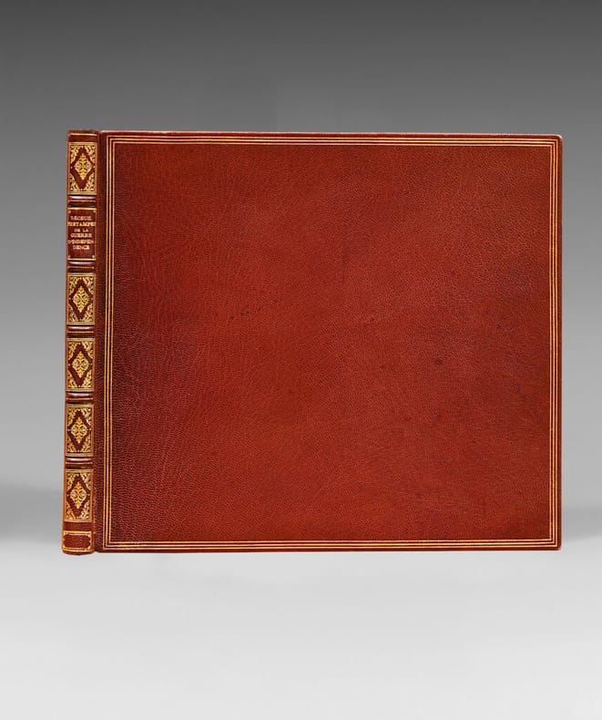 Il s’agit du seul ouvrage contemporain des faitspublié en France sur le sujet. Paris, Ponce, s.d. [vers 1783]. Grand in-4 de 16 planches gravées, plein maroquin vieux rouge, triple filet doré autour des plats, dos à nerfs richement orné, double filet or sur les coupes, roulette dorée intérieure, tranches dorées. Reliure signée Zaehnsdorf, England. 202 x 224 mm.