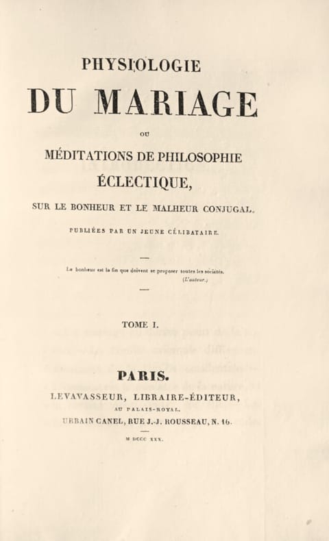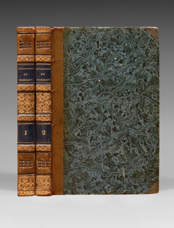 Edition originale «rare et recherchée» (M. Clouzot) de ce livre lucide et cruel qui peut être considéré comme la première œuvre personnelle de Balzac. Carteret, I, p.58 ; Destailleur, 1363. Exemplaire de tout premier tirage avec l'erreur de pagination au tome I (p. 332 au lieu de 328). Édition originale, parue sans nom d'auteur, avec une introduction signée H. B ... c. Elle porte en exergue, sur la page de titre, cette phrase : Le bonheur est la fin que doivent se proposer toutes les sociétés. Partant de quelques réflexions que Napoléon confiait au Conseil d'État lors de la discussion du Code civil, Balzac voit dans le mariage une aventure charnelle, nécessairement décevante, une affaire d'intérêts financiers, dont le gros problème est l'adultère. Proche, par ses anecdotes, du vaudeville, l'ouvrage apparaît comme une des clefs de la Comédie humaine, où la morale du mariage est l'objet d'une observation sociale et politique non exempte de féminisme. Parmi les nombreuses anecdotes relatives aux ingéniosités et aux artifices des amants, Balzac rapporte, comme sienne, celle de la méditation XXIV du Point de lendemain de Vivant Denon, dont il rappelle, à la page 204, le récit imprimé à vingt-cinq exemplaires par Pierre Didot. C'est sur l'exemplaire n° 24 que l'auteur a pris des éléments de cette narration qui a le mérite de présenter à la fois de hautes instructions aux maris ; et aux célibataires la peinture des mœurs du siècle dernier. En tête de l'errata du second volume, Balzac raille : Pour bien comprendre le sens de ces pages, un lecteur honnête homme doit en relire plusieurs fois les principaux passages ; car l'auteur y a mis toute sa pensée. Se remémorant sa pratique d'imprimeur, l'écrivain s'est diverti en remplissant les pages (207)-210 d'un galimatias de lettres en partie sens dessus-dessous, ne formant aucune phrase ni mot intelligibles et abondamment caviardées de signes dénués de signification ; elles sont disposées sous un intitulé de chapitre portant Des religions et de la confession considérées dans leur rapport avec le mariage ; à la suite est rappelée la boutade de La Bruyère : C'est trop contre un mari que la dévotion et la galanterie : une femme devrait opter. Cette édition a la particularité de posséder 4 pages en grande partie illisibles, en l’occurrence le chapitre I de la 15è méditation, traitant des «Religions et de la confession considérées dans leur rapport avec le mariage» (pages 207 à 210 du tome 2), fait de lettres à l’endroit et à l’envers, de blocs, tirets, parenthèses, etc. «On trouve au tome II, Méditation XXV, chapitre 1er, à la cinquième ligne, pages 207 à 210, une composition typographique incohérente, énigmatique, sorte de fantaisie dans le genre de Sterne, et dont Balzac donne, tome II, page 347, une explication pleine d’humour.» (Carteret, I, p.58) Bel exemplaire en reliure de l’époque, provenant des prestigieuses bibliothèques Bourbon de Rouvre et d’Henri Beraldi. Il fut relié sans le feuillet d’avertissement aux Lecteurs. A la vente Beraldi (III – 1934, n°9) sa reliure était reproduite hors texte et il était sobrement décrit: «Rare et bel exemplaire dans sa reliure de l’époque».