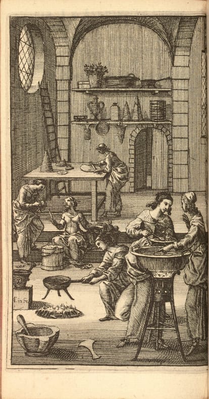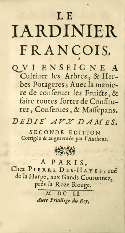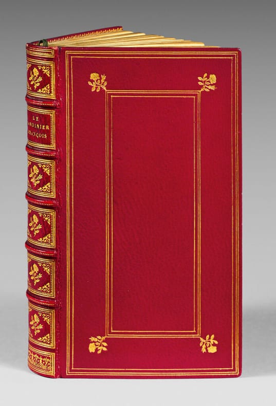 Seconde édition originale augmentée par rapport à la première parue cette même année 1651. Elle est si rare que Vicaire ne la connait pas. «Personnage à la fois introduit à la cour, où il porte le titre de valet de chambre du Roi, et propriétaire rural faisant commerce d’arbres et de graines, Nicolas de Bonnefons est l’un des principaux représentant de la vogue d’horticulture et de culture potagère qui gagne la société française au cours du 17ème siècle. Son Jardinier françois connaît un grand succès de librairie dès l’édition originale de 1651 et sera continûment réédité sans grand changement jusqu’en 1737. Si les deux premières parties du livre traitent respectivement de la culture des arbres fruitiers et de celle des jardins potagers, la troisième et dernière consiste en un traité de confiture. Sa principale originalité par rapport aux autres confituriers du 17ème siècle tient à la place accordée à la conservation des fruits sans préparation particulière: l’ouvrage s’ouvre par un long discours d’économie domestique exposant la manière de construire un fruitier et les façons diverses d’y conserver les fruits en leur naturel, selon leurs variétés, après quoi vient un chapitre consacré aux fruits que l’on sèche naturellement, sans les réduire en pâte. La suite du traité appartient davantage à l’art du confiseur à proprement parler, en proposant aussi bien des recettes de confitures que des recettes de pâtes de sucre permettant de contrefaire diverses figures d’aliments et de fruits – art d’illusion qui contribuait grandement au prestige des collations ou du service final du fruit dans les festins.» (Jean-Marc Chatelain). «Frontispice gravé, les 13 ff. limin. sont occupés par le titre, «l’épistre aux dames » signée : RDCDWBDN et datée de Paris, le 1er juillet 1651, la «préface au lecteur», et la table. Les initiales sont, à rebours, celles des prénom, nom et qualité de l’auteur, Nicolas de Bonnefons, valet de chambre du Roi. Le Jardinier françois est orné, en plus du frontispice, de trois figures, gravées par Chauveau, placées en tête de chacun des trois traités qui le composent. La première qui représente un jardin potager dans lequel travaillent des jardiniers et se promènent un seigneur et une dame, se trouve avant la page1; la seconde représentant un jardin, avant la page 117; et la troisième montrant un intérieur de cuisine, avant la page 245. Le premier traité occupe les pages 1-116; le second, les pages 117-244, et le troisième les pages 244 à 380. Ce dernier a rapport aux fruits, à leur conservation, aux confitures sèches et liquides, ainsi qu’aux «massepans» et aux macarons. Le privilège est imprimé au dernier feuillet (recto et verso); il est daté du «12ème jour de Iuin 1651» et l’achevé d’imprimer du «premier iour de Iuillet» de la même année. Il faut croire que le succès du Jardinier françois fut grand, car, paru pour la première fois en 1651, il en était déjà, deux ans plus tard, à sa quatrième édition, ainsi qu’on peut le voir sur le titre de l’édition suivante.» (Vicaire). Un des ouvrages emblématiques des évolutions du goût culinaire en France au mitan du 17èmesiècle. L’agronome Nicolas de Bonnefons est «un des principaux représentants de la vogue d’horticulture et de culture potagère qui gagne la société française au cours du 17ème siècle» (Jean-Marc Chatelain, dans Livres en bouche, Paris, BnF, Hermann, 2001, p. 147). Or c’est dans le milieu des agronomes que s’opérèrent les mutations les plus décisives dans la cuisine française au début du règne de Louis XV, dans le sens d’une «promotion inédite de la notion de saveur naturelle, obtenue par une meilleure exploitation des ressources du jardin et du verger» (op. cit., p. 120). Son ouvrage aborde ainsi ces deux aspects qu’il lie étroitement: les deux premières parties sont consacrées à la culture des arbres fruitiers et à celle des jardins potagers, tandis que «la troisième et dernière consiste en un traité de confiture. Sa principale originalité par rapport aux autres confituriers du 17ème siècle tient à la place accordée à la conservation des fruits sans préparation particulière [… Cette troisième partie] appartient davantage à l’art du confiseur à proprement parler, en proposant aussi bien des recettes de confitures que des recettes de pâtes de sucre permettant de contrefaire diverses figures d’aliments et de fruits – art d’illusion qui contribuait grandement au prestige des collations ou du service final du fruit dans les festins». (op. cit., n° 120, pour l’édition originale). La présente édition est ornée de 4 jolies figures gravées en taille-douce signés par François Chauveau, dont une placée en frontispice. Très bel exemplaire en maroquin signé de Trautz-Bauzonnet. Provenance: Des bibliothèques Huth; Alfred Henry Huth; James Toovey; le diplomate Michel Pierre Antoine Laurent Agar, comte de Mosbourg (vignette ex-libris au verso de la première garde volante); puis Bulletin Morgand 32 n° 23436.