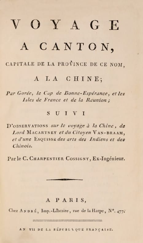 Edition originale de ce récit de voyage en Chine à la fin du XVIIIe siècle. Exemplaire à la date de l’an VII (d’autres portent VI). Cordier, Sinica, 2105; Ryckebusch, 1600. L’auteur spécialiste de l’indigo, du café et des épices livre la relation de son voyage et apporte aussi des observations critiques du récit des voyages en Chine de Macartney et Van Braam (Boucher de la Richarderie, V, p. 288). Très bel exemplaire au dos lisse de maroquin rouge finement orné d’un harmonieux décor néo-classique.