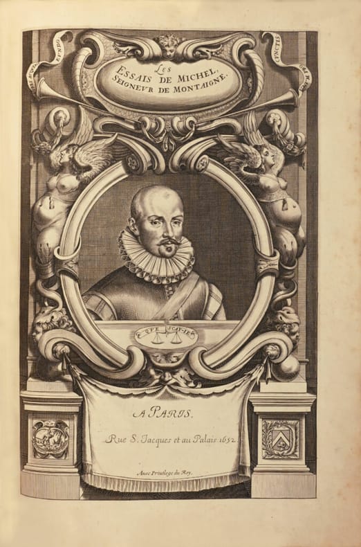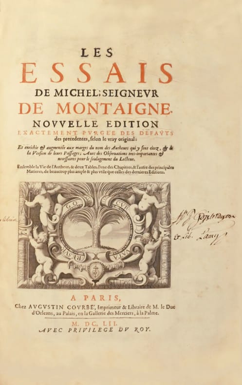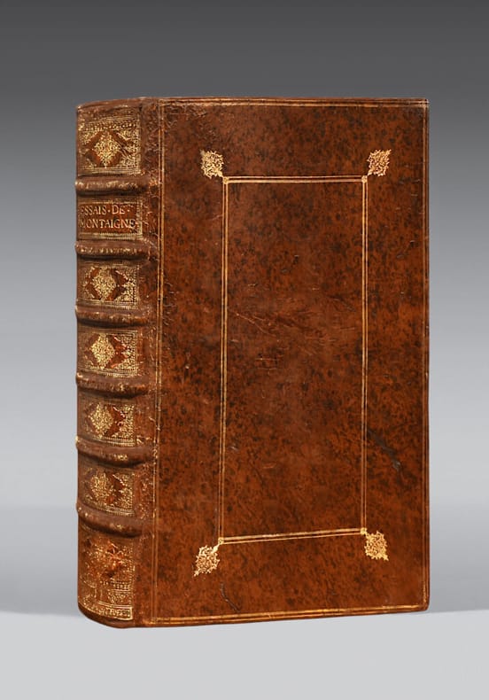 «Bonne édition faite sur l’édition de 1635 ; les traductions y sont placées pour la première fois en regard du texte. » Elle a été partagée entre Augustin Courbé, Pierre Rocolet, Et. Loyson, Edme Couterot, Pierre Le Petit, Th. Jolly, Sébastien Huré, etc.» (Tchermerzine, IV, 902). Il s’agit de la troisième édition in-folio. Elle comprend bienl'"Epistre de Mademoiselle de Gournay" et sa préface. « Quoiqu’on ait pris beaucoup de libertés avec lui, le texte est, pour l’essentiel, celui de la dernière édition de Mademoiselle de Gournay publiée en 1635, qui reparaît (...) pour la première fois. » In Les Essais de Montaigne Exposition Bibliothèque Municipale de Bordeaux, 1980-1981. Elle est ornée du célèbre portrait-frontispice de Montaigne gravé en taille-douce. Séduisant exemplaire, immense de marges, conservé dans sa reliure de l’époque.