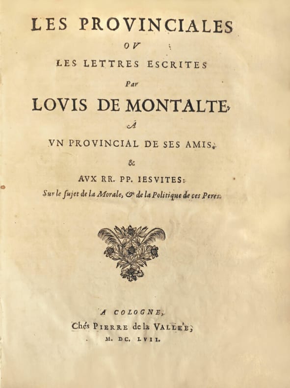 Edition originale des 19 lettres provinciales, imprimées séparément de 1655 à 1657 et réunies sous un titre général, suivi de 3 feuillets «d’advertissement » qui n'ont pas été insérés dans tous les exemplaires. L'Avertissement est ici en premier tirage avec l'orthographe « avertissement » et la mention de «XVII lettres ». La 17ème lettre présente bien aussi les caractéristiques du 1er tirage plus recherché, en 8 pages. Tchemerzine. Éditions originales, V, 62 à 67. La collation est conforme à celle donnée par Tchemerzine : « Première lettre (23 janvier 1656), 8 pp. ; 2ème lettre (29 janvier), 8 pp. ; 3ème lettre (9 février), 8pp. ; 4ème lettre (25 février), 8 pp. ; 5ème lettre (20 mars), 8 pp. ; 6ème lettre (10 avril), 8 pp. ; 7ème lettre (25 avril), 8 pp. ; 8ème lettre (28 mai), 8 pp. ; 9ème lettre (3 juillet), 8 pp. ; 10ème lettre (2 août), 8 pp. ; 11ème lettre (18 août), 8 pp. ; 12ème lettre (9 septembre), 8 pp. ; 13ème lettre (30 septembre), 8 pp. ; 14èmelettre (23 octobre), 8 pp. ; 15ème lettre (25 novembre), 8 pp. ; 16ème lettre (4 décembre), 12 pp. ; 17ème lettre (23 janvier 1657), 12 pp. ; 18ème lettre (24 mars 1657), 12 pp. » Le recueil contient en outre à la suite de la 12ème lettre, la réponse en 8 pp. et la Réfutation de la Réponse en 8 pages, qui constitue ainsi la 19ème lettre Provinciale de Pascal. Il contient enfin la réponse à la 13ème lettre en 8 pp., à la 14ème lettre en 8 pp. et à la 15ème lettre en 8 pp. Précieux exemplaire en condition rare, enrichi d'un nombre impressionnant de pièces de controverses en édition originale, revêtu de sa très plaisante reliure strictement d'époque en vélin, constituant ainsi un épais volume de 935 pages. Les pièces des controverses ajoutées à l'époque, en édition originale, soit 739 pages, sont notamment les suivantes : — Lettre d'un docteur en théologie à un homme de grande condition de ses amys, touchant les questions du temps. 24 pp. — Lettre de Mr Arnaud à Mr Messier curé de S. Landry, 24 novembre 1655. 2 pp. — Lettre de Mr Arnaud aux docteurs de la Faculté de Théologie de Paris. 16 janvier 1656, 3 pp. — Traduction de 2 lettres de Mr Arnaud au Pape et à la Faculté. 26 août et 10 novembre 1655, 4 pp. — G. Le Roy abbé de Hautefontaine. Lettre sur la constance. 1661, 32 pp. Barbier, II, 1207. — Octave ou dialogues familiers sur les disputes du temps. 1663, 78 pp. — Arnauld. Nicole. Mémoire touchant les moyens d'appaiser les disputes présentes. 1661. Barbier, III, 180, 8 pp. — Arnauld. Considérations sur la lettre composée par M. L'evesque de Vabres. Barbier, I, 38 pp. — Anne de Levis de Ventadour. Lettres pastorales de Monseigneur, archevêque de Bourges. 1659, 16pp., 32 pp., 12 pp. — Anne de Levis de Ventadour. Censure d'un livre intitulé apologie pour les casuistes. 1659, 40 pp. — Requête des curés d'Évreux. 1659, 12 pp. — Lettre pastorale de monseigneur l'évêque de Chaalons. 1658, 8 pp. — Lettre pastorale de monseigneur l'évêque de Chaalons. 1659, 12 pp. — Godeau Antoine. Ordonnance de monseigneur l'évêque de Vence. 1659, 12 pp. — Forbin de Janson. Lettre pastorale monseigneur évêque de Digne. 1639, 16 pp. — Harley de Champallon. Censure d'un livre intitulé Apologie pour les casuistes, contre les calomnies des jansénites. 1639, 8 pp. — Récit du différend entre Messieurs les curés et les PP Jésuites de la ville de Nevers. 1658, 12 pp. — Contes J. B. et Hodencq. A. de. Censure d'un livre intitulé apologie pour les casuistes. 1658, 22 pp. — Solminihac. Censure d'un livre intitulé Apologie pour les casuistes. 1639, 12 pp. — Arnauld. Censure d'un livre...1658, 6 pp. — Lettre pastorale de Mgr l'évêque de Beauvais. 1658, 14 pp. — Lettre de Mrs les curés de Paris avec la réponse. 1658, 4 pp. — Gondrin H. de. archevêque de Sens. Censure d'un livre intitulé Apologie... 1658, 24 pp. — Lettre pastorale. Monseigneur évêque de Tulle. 1658, 4 pp. — Factum pour les curés de Rouen. 1658, 12 pp. — Dufour Charles. Lettre d'un curé de Rouen. 1656, 12 pp. — Requeste des curés de Rouen. 1656, 4 pp. — Requeste des curés d'Amiens. 1658, 20 pp. — Décret de N.S.P. Le Pape Alexandre VII 1659, 4 pp. — Censure de plusieurs mauvaises propositions des nouveaux casuistes. Louvain. 1657. 20 pp. — Condamnation d'un prêtre à Caen. 1661, 12 pp. — Dufour Charles, Nicolle Pierre, Mémoire sur la compagnie de l'Hermitage à Caen. 1660, 40 pp. Barbier, III, 142. — Lettre de Mrs les curés de Sens à Mrs les curés de Paris. 1659, 8 pp. — Lettre de Monsieur l'abbé Doyhenard, trésorier de l'église de Nantes, écrite a monseigneur l'évêque D*** au sujet des affaires du tems. Nantes, 1747. 24 pp. Georges Langlois, seigneur de Colmoulins [?] (ex-libris armorié aux armes écartelées Langlois, Florette et Le Fèvre de Caumartin). La mère de Georges Langlois, Marie de Florette, était la fille d'Elisabeth Lefèvre de Caumartin et de Jean Florette. En 1642, Georges Langlois est premier président de la chambre des comptes de Normandie. Il devient seigneur de Motteville en 1658. «Chanlatte», lié à Port-Royal. Plusieurs membres de la famille furent élèves aux Petites Écoles de Port Royal (Frédéric Delforge, Les Petites Écoles de Port-Royal : 1637-1660, Éditions du Cerf, 1958, p. 227 ; Antony Me Kenna, Les Petites écoles de Port-Royal, p. 23). Parmi eux, dom Noël Chanlatte, vicaire de Beaune, et Cécile Chanlatte (Jérôme Besoigne, Histoire de l'abbaye de Port-Royal, Cologne, 1752, tome I, p. 413). Un Noël Chanlatte succéda, en octobre 1648, à Etienne Pascal, père de Blaise, comme locataire de la maison de la rue Brisemiche dans le quartier de Saint-Merri (Archives nationales, MC/RS//436). Notons enfin que Nicolas Chanlatte, échevin de Paris et directeur du commerce des Indes, était oncle de Louis Gorin de Saint-Amour (1619-1687), docteur en Sorbonne qui fut mêl