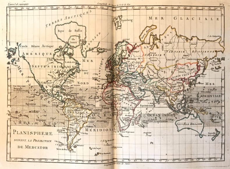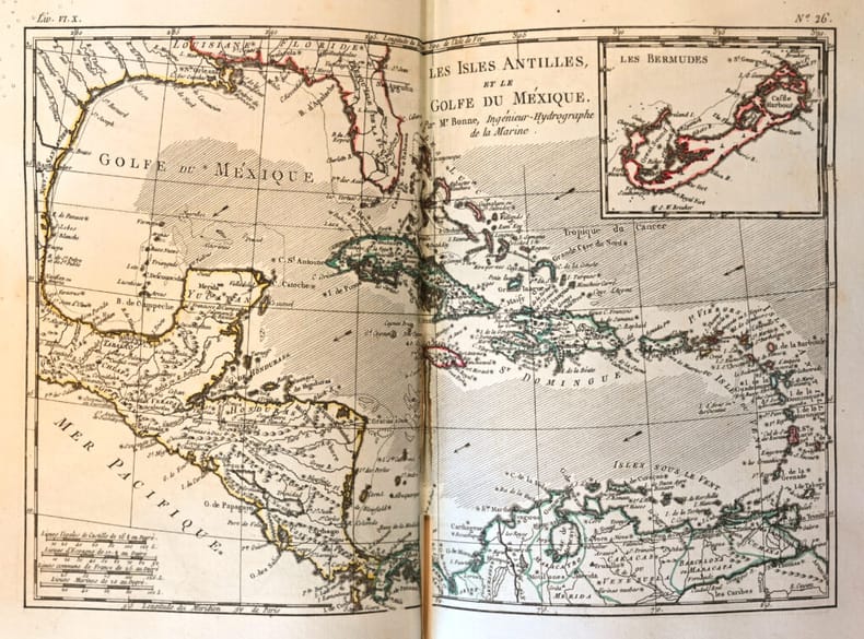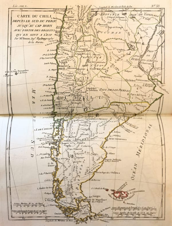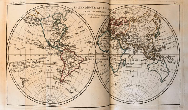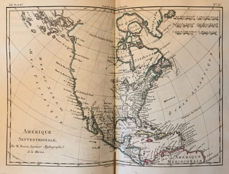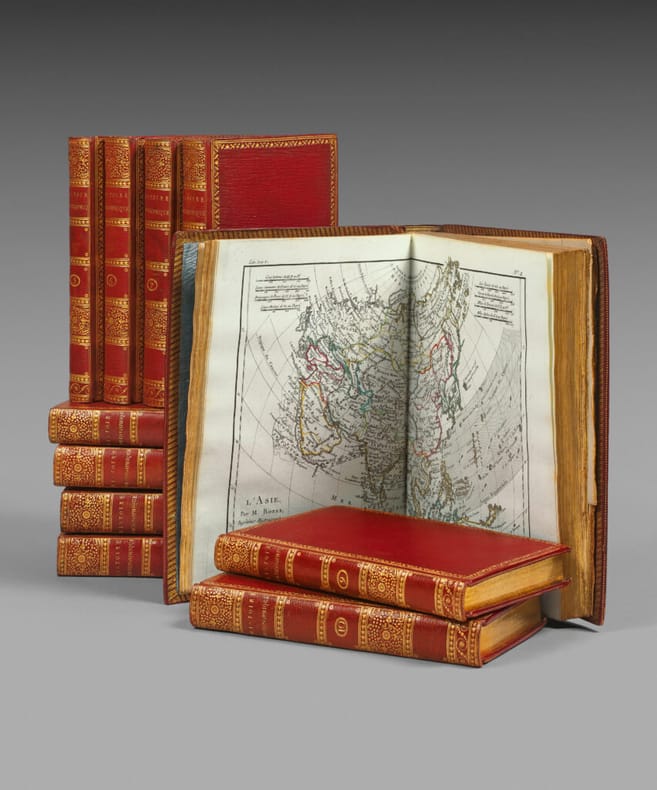 Les bibliographes soulignent l'extrême importance de cette troisième édition originale à ce point truffée et radicalisée par Diderot qu'elle constitue un nouvel ouvrage totalement révolutionnaire et condamné par le Parlement, qui valut la gloire et l'exil à son auteur. Genève, Jean-Leonard Pellet, 1780. 10 volumes in-8 et un volume in-4 d'atlas: I/ 1 portrait, xvi pp., 532 pp., (2) ff.bl.; II/ (2) ff., 1 gravure, viii pp., 582 pp.; III/ (2) ff., 1 gravure, vii pp., 580 pp.; IV/ (2) ff., 1 gravure, viii pp., 472 pp.; V/ (2) ff., 1 gravure, vii pp., 405 pp.; VI/ (2) ff., 1 gravure, vii pp., 484 pp., pp. 281-304 reliées en double; VII/ (2) ff., 1 gravure, table des pp. v à xvi, 558 pp.; VIII/ (2) ff., 1 gravure, viii pp., 548 pp.; IX/ (2) ff., 1 gravure, table pp. v à viii, 412 pp.; X/ (2) ff., 1 gravure, table des pp. v à vi, 538 pp. Atlas: (2) ff., 28 pp., 1 carte dépliante, 49 cartes sur double page, 23 tableaux dont 12 dépliants et 1 sur double page. Maroquin rouge, double filet doré et roulette autour des plats, dos lisses très joliment ornés avec fers spéciaux, roulette intérieure, tranches dorées. Reliure de l'époque. 202 x 123 mm; 257 x 203 mm pour l’atlas.