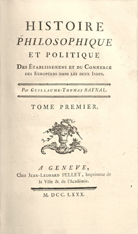 «Edition originale » de cet « ouvrage clef de la crise de l’Ancien régime», truffé de morceaux de l’éloquence révolutionnaire, souvent dus à la plume de Diderot. Les bibliographes soulignent l'extrême importance de cette troisième édition originale à ce point truffée et radicalisée par Diderot qu'elle constitue un nouvel ouvrage totalement révolutionnaire et condamné par le Parlement, qui valut la gloire et l'exil à son auteur. Précieux exemplaire de l’édition de format in-8 publiée en même temps que l'édition de format in-4. Exemplaire bien complet des 10 frontispices dont un portrait par Cochin et 9 figures par Moreau gravés par Dambrun (1), de Launay (6), Delignon (I), Romanet (1) et Simonet (1), et de l'atlas qui contient 50 planches numérotées 1 à 49, avec une planche 17 bis, et 23 tableaux dépliants. «Jésuite né dans l'Aveyron en 1713, l'abbé Raynal monta à Paris et quitta bientôt l'Église pour la Philosophie. Il collabora à l'Encyclopédie, au Mercure de France et à la Correspondance littéraire, et rédigea des travaux alimentaires ou livres de propagande, inspirés par le gouvernement français : ‘Histoire de Stathouderat’ (1747), ‘Histoire du Parlement d'Angleterre’ (1748). Il reçut commande d'une histoire de la colonisation qui aurait pu n'être qu'une compilation supplémentaire, s'il n'avait rassemblé autour de lui une pléiade de collaborateurs, d'Holbach, Naigeon et surtout Diderot, et si l'entreprise commerciale ne s'était muée en un grand traité politique et philosophique. Une seconde édition augmentée paraît en 1774 et une troisième, signée par Raynal et radicalisée par les interventions de Diderot, en 1780. C'est la répression et la gloire pour l'abbé Raynal: le Parlement condamne l'ouvrage, l'auteur doit s'exiler, il assume le personnage du philosophe persécuté, à travers l'Europe, avant d'être autorisé à s'installer à Marseille. Les révolutionnaires étaient prêts à accueillir le septuagénaire comme un maître à penser et à agir ; ils furent plus que déçus, furieux du discours conservateur que leur tint cet auteur, dépassé par son œuvre. » Diderot fut donc l’un des principaux rédacteurs. «Sous le masque de Raynal [il] s'abandonne à toute sa fougue libertaire, contestataire et dénonciatrice. Il abomine l'intolérance, l'influence de l'église dans les affaires temporelles, n'admet qu'une morale universelle, celle qui a pour objet la conservation et le bonheur commun de l'espèce humaine... ». (Raymond Trousson). « L'Histoire des deux Indes mêle de fait une banale histoire des explorations et des installations commerciales européennes dans le monde et une dénonciation parfois violente de l’esclavage et l'exploitation des colonies par les métropoles. Les emprunts aux mémoires administratifs et aux traités antérieurs alternent avec des morceaux d'éloquence révolutionnaire, souvent dus à la plume de Diderot.» (Michel Delon, En Français dans le texte, Dix siècles de lumière par le livre, n°166). Ce traité ainsi enrichi de morceaux littéraires de choix connut un éclatant succès et fut réédité une dizaine de fois à la fin du XVIIIe siècle. La critique universitaire le considère comme l’un des ouvrages clefs de la crise de l’Ancien Régime. Superbe exemplaire, de parfaite fraîcheur, imprimé sur papier de Hollande aux nuances bleutées, revêtu de très élégantes reliures de l’époque en maroquin rouge.