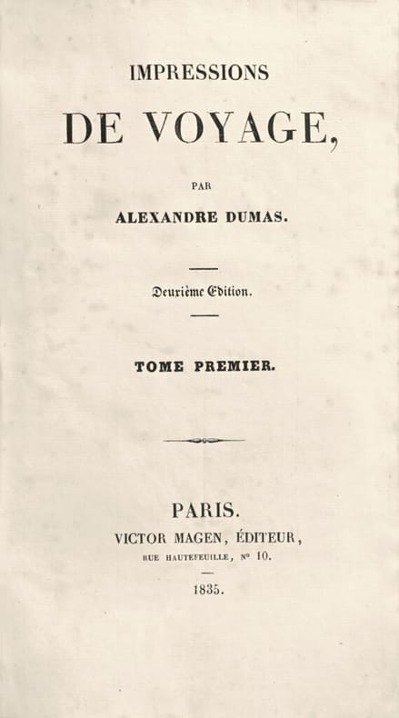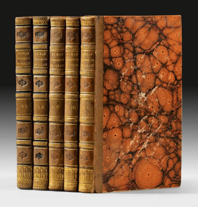 Exemplaire magnifiquement relié de ce texte célèbre d’Alexandre Dumas, de toute rareté en édition originale. Les tomes 3, 4 et 5 parus chez Dumont en 1837 sont ici en édition originale. Les deux premiers volumes formant pour ainsi dire une première partie présentent ici le texte de l’édition originale de 1834 avec un titre de relais portant la mention deuxième édition et la date de 1835. Les cinq volumes furent reliés à l’époque pour un amateur exigent en demi veau orné en queue des dos d’un décor à la cathédrale. «L’ensemble est rare» (Carteret, I, 229). «Un pur régal que les voyages du Dumas père en Suisse» (Mortimer). «Ce livre d’Alexandre Dumas père (1803-1870), publié entre 1835 et 1859, ne manque ni d’intérêt, ni de qualité. L’insatiable curiosité de l’auteur nous vaut de nombreuses descriptions et des notes sur quantités de pays […]. Ces Impressions de voyage sont, pour Dumas, un moyen de donner libre cours à son étonnante facilité de conteur et mettent puissamment en lumière ses dons d’observateur.» (Dictionnaire des Œuvres, III, 693). «Après s’être fait un nom au théâtre, Alexandre Dumas s’est essayé dans le roman, et a utilisé, dans des compositions d’un genre nouveau, les souvenirs, les tableaux, les anecdotes qu’il avait recueillis dans plusieurs voyages en Suisse et en Italie. Les premiers volumes des Impressions de voyage ont obtenu un succès mérité par la gaieté, l’entrain, l’esprit qui y étincellent à chaque page. Le style de cet ouvrage est franc, rapide; les allures de la narration sont vives, libres et dégagées, comme le caractère et l’humeur de l’aimable touriste.» (Dictionnaire encyclopédique de Ph. Le Bas, 775). «Ces Impressions de voyage sont le premier très long récit de Dumas: il est frappant que l'on y trouve, en germe, tous les genres qui donneront plus tard naissance à ses grands succès. Le terme « impressions » est on ne peut mieux choisi. Dumas est un impressionniste, avant même que l’on associe ce qualificatif aux peintres. Le journal de voyage est bien un recueil d'impressions, devant les êtres et la majestueuse nature. Dumas les dépose sur le papier, et donne envie au lecteur d'aller les vérifier sur place. Il est peintre à sa façon. Et pourtant, modestement, Dumas, dans une description presque féerique d'une vieille et de son fils, prétend qu'il faudrait être « Rembrandt pour fixer sur la toile, avec sa couleur ardente et son expression pittoresque, ce tableau bizarre ». Mais la description qu’il en fait est si précise, elle laisse tellement ressentir la puissante poésie de la scène, qu'il n'est nul besoin d'un peintre pour en saisir davantage. Dumas est, réellement, un peintre des mots. Ce qui donne davantage de valeur à ces récits, ce sont les réflexions philosophiques qu'ils éveillent chez Dumas. Dans la plupart des œuvres qui suivront, l’auteur s’éloignera régulièrement de l’histoire pour la commenter. Ici, plus que jamais, il laisse libre cours à ses pensées qui ne peuvent manquer de faire réfléchir le lecteur. Ainsi, quand Dumas découvre que la pêche et la chasse ne sont pas toujours des jeux, mais peuvent aussi, pour certains, être un dur travail, parfois mortel, il écrit : «C'est dans les hommes mêmes qu'elle veut faire libres que la liberté trouve ses plus grands obstacles». Ailleurs, méditant sur le deuil, Dumas constate : « ... aux ailes de la poésie et de la religion, comme à celles des aigles, il faut la solitude et l'immensité ». On ne peut passer sur de telles observations sans s’arrêter, sans chercher à aller plus loin. Les Impressions de voyage n'ont pas à être lues page après page. On peut les prendre n'importe où, pour simplement goûter une partie de ce long itinéraire. On peut également, si l'on est impatient, sauter quelques pages pour retrouver plus rapidement un personnage attachant ou intrigant : par exemple, cet Anglais ou Pauline que Dumas croise à différents moments du voyage.» (Marie Douville). Hormis quelques rousseurs éparses naturelles dans un exemplaire en condition d’époque non lavé remarquable exemplaire d’un livre fort rare en très élégante reliure romantique de l’époque. «Un bel exemplaire en reliure d’époque mérite un net effort financier». (Clouzot).