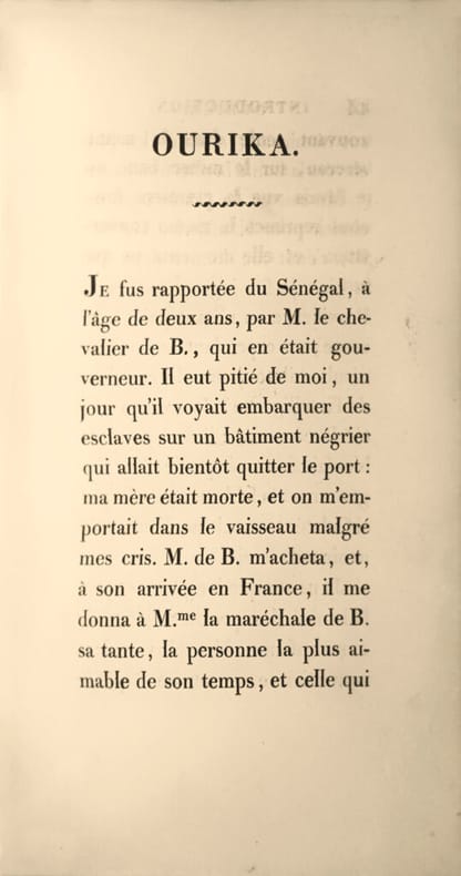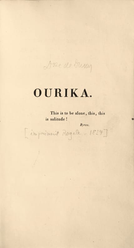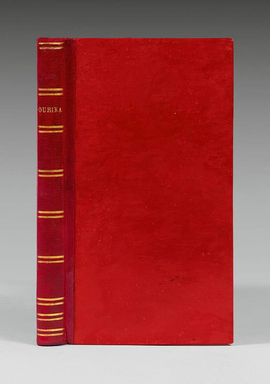 Précieuse et véritable édition originale de l’un des romans les plus rares de la littérature du XIXe siècle. Carteret, I, 250. Elle ne fut tirée, d’après La Rochebilière, qu’à 40 exemplaires, sans page de titre et non mis dans le commerce. Les exemplaires furent distribués par la duchesse à ses proches. «Extrêmement rare, tiré à très petit nombre (25 ou 40 exemplaires)». M. Clouzot, Guide du Bibliophile, 113. «La duchesse de Duras (1778-1828), fille d’un capitaine de vaisseau, le comte de Kersaint, mort sur l’échafaud, émigre avec sa mère à la Martinique, puis se fixe à Londres où elle épouse le duc de Duras, un autre émigré. Elle rentre en France après le 18 brumaire, mais, pendant tout l’Empire, vit retirée avec son mari dans son château de Touraine, où elle n’a de relations avec le monde des lettres que son amitié pour Chateaubriand, et surtout pour Mme de Staël. Avec la Restauration, le duc de Duras est nommé maréchal de France, et la duchesse, rentrée à Paris, tient un salon littéraire assez fermé, où c’est en quelque sorte une consécration mondaine d’être admis. Elle publie deux romans bien accueillis du public». (Dictionnaire des auteurs, II, 78). «Sous la Restauration, le salon de Mme de Duras était un des plus brillants. ‘Bientôt, dit Sainte-Beuve, il se forma dans les boudoirs aristocratiques une petite société d’élite, une espèce d’hôtel de Rambouillet adorant l’art à huis clos…’.». La parution d’Ourika en 1824 procura à la duchesse de Duras l’un des plus grands succès du roman féminin. Instantanément à la mode, cette nouvelle brossait avec finesse l’Histoire d’une jeune esclave noire éprise du fils de ses protecteurs. «Je fus rapportée du Sénégal, à l’âge de deux ans par M. Le Chevalier de B. qui en était gouverneur. Il eut pitié de moi, un jour qu’il voyait embarquer des esclaves sur un bâtiment négrier qui allait bientôt quitter le port: ma mère était morte, et on m’emportait dans le vaisseau malgré mes cris. M. de B. m’acheta, et, à son arrivée en France, il me donna à Mme la marechale de B. sa tante, la personne la plus aimable de son temps…» Très bel exemplaire de cette édition originale littéraire d’une mythique rareté, de toute fraîcheur et revêtu d’une fine reliure en demi-maroquin rouge de l’époque.