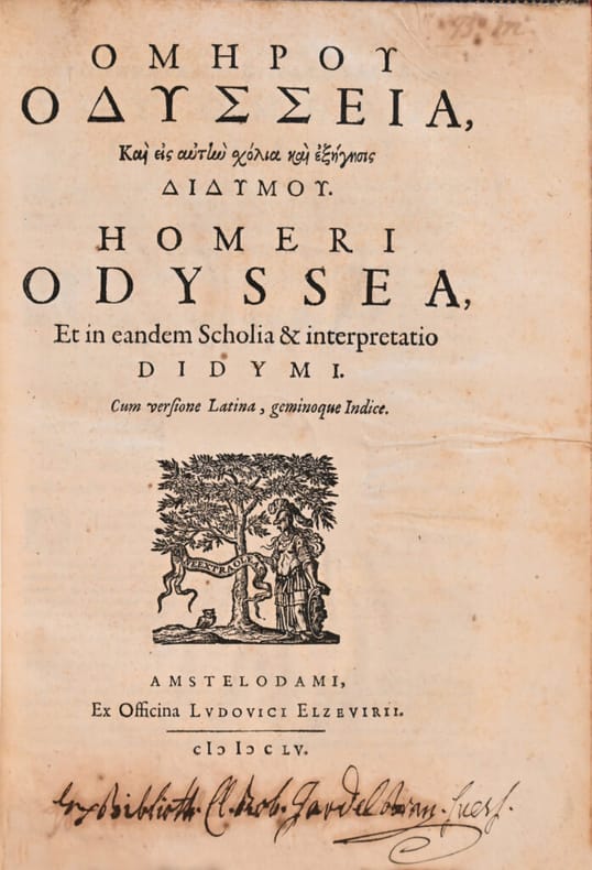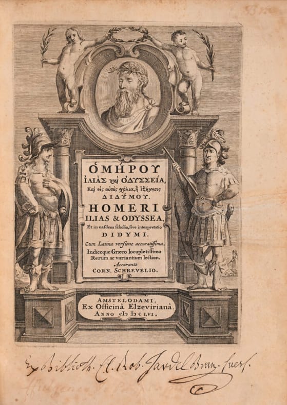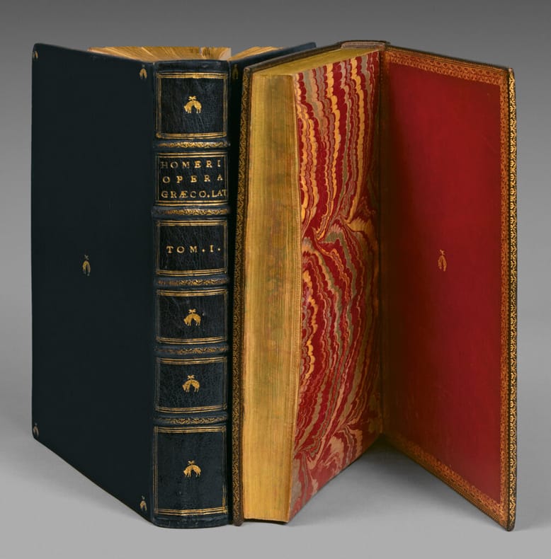 «Belle édition, dont le texte est formé sur ceux de Turnière et d’Estienne.» Brunet III, colonne 272. Edition en grec, accompagnée de la traduction latine. « Le plus grand fait de la civilisation grecque reste toujours ceci, qu’Homère devint de si bonne heure panhellénique. Toute la liberté intellectuelle et humaine où parvinrent les Grecs revient à ce fait… De temps en temps s’éleva du fond le plus intime de l’hellénisme une protestation contre Homère; mais il resta toujours vainqueur. Toutes les grandes puissances spirituelles exercent à côté de leur action libératrice, une autre action déprimante; mais, à la vérité, cela fait une différence que ce soit Homère ou la Bible ou la Science qui tyrannise les hommes !» Nietzsche. «Inscrivez en tête d’un papier le nom d’Homère. C’est le plus grand nom, mon enfant. Les dieux ne seraient rien, et non seulement les dieux, mais les hommes, s’il ne les avait pas chantés… Rien n’est aussi pur qu’Homère… C’est le plus grand. C’est le plus vieux. C’est le patron. C’est le père. Il est le maître de tout. Et notamment il est le maître de tout ce qu’il y a jamais eu de plus grand dans le monde, qui est le familier.» Charles Péguy. Merveilleux exemplaire relié spécialement par Boyet pour Hilaire-Bernard de Roqueleyne, Baron de Longepierre, « Longepierre (1659-1721) se distingua tellement de ses condisciples, dans ses études classiques, que Baillet le plaça parmi les Enfants célèbres. Il composa, comme on le sait, plusieurs tragédies qui toutes, à l’exception de sa ‘Médée’, eurent une fin tragique. Le succès de sa ‘Médée’ fit qu’il ne voulut d’autres signes héraldiques sur ses livres que la Toison d’Or. L’amour des livres contribua peut-être plus à sa notoriété que ses pièces de théâtre. L’auteur dramatique est presque oublié aujourd’hui, tandis que le bibliophile est resté en grande réputation parmi les amateurs.» (J. Guigard. Nouvel armorial du Bibliophile. Paris, 1890). Cet exemplaire fut vendu 200000 FF (30500 €) le 5 juin 1988, il y a 34 ans (Ref. Livres précieux, n°83). Ex-libris manuscrit ancien sur le titre et ex-libris gravé au verso de C.L. Robert Jardel.