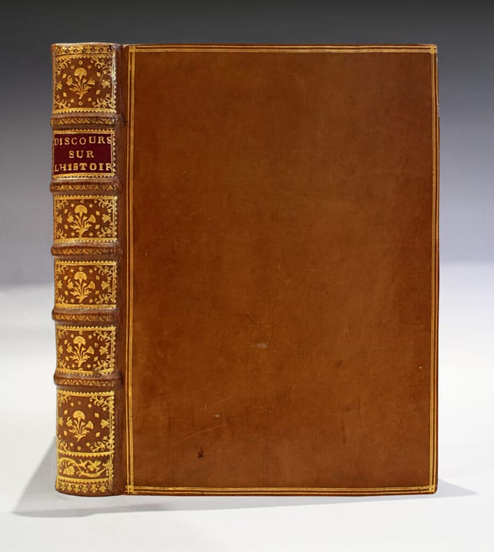 "Le ‘Discours sur l’Histoire universelle’ qui parait en 1681 est un éblouissant chef-d’œuvre qu’on a pu comparer à ‘La Cité de Dieu’ de Saint Augustin et qui se présente comme une philosophie de l’histoire, depuis les origines jusqu’à l’époque chrétienne." Paris, Sébastien Mabre-Cramoisy, 1681. In-4 de (1) f., 561 pp., (7). Relié en veau blond glacé de l’époque, triple filet doré d’encadrement sur les plats, dos à nerfs orné de fleurons dorés, pièce de titre de maroquin rouge, double filet doré sur les coupes, tranches rouges. Reliure de l’époque. 257 x 188 mm.