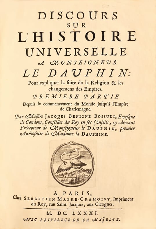 «Le ‘Discours sur l’Histoire universelle’ qui parait en 1681 est un éblouissant chef-d’œuvre qu’on a pu comparer à ‘La Cité de Dieu’ de Saint Augustin et qui se présente comme une philosophie de l’histoire, depuis les origines jusqu’à l’époque chrétienne. Très informé, fondé sur une multitude de faits, sur une connaissance de l’histoire, particulièrement de l’histoire romaine, aussi complète qu’on la pouvait avoir à cette date, il a pour idée centrale que Dieu gouverne le monde dans le respect de la liberté humaine. «Ce qui est hasard à l’égard de nos conseils incertains est un dessein concerté dans un conseil plus haut, c’est-à-dire dans ce conseil éternel qui renferme toutes les causes et tous les effets dans un même ordre». De bons esprits continuent de tenir le ‘Discours’ pour l’œuvre capitale de Bossuet et aussi pour une des œuvres capitales de la littérature française. Montesquieu ne l’a pas éclipsée. Elle est unique par la majestueuse grandeur des vues et la précision contrôlée du détail. Si cette œuvre grandiose a marqué dans l’histoire de l’esprit humain, elle a marqué aussi une étape dans l’histoire de l’esprit de Bossuet. Elle a formé en lui, peut-on dire, l’historien au sens moderne du mot». Le ‘Discours sur l’Histoire universelle’ est aussi un cours d’histoire générale qui fut écrit uniquement pour l’éducation du dauphin. Fondé sur la Révélation, il embrasse toute la suite des temps qui se sont écoulés depuis la création du monde jusqu’à l’empereur Charlemagne. «Il se divise en trois parties; la première s’intitule ‘Les époques’; la seconde, ‘La suite de la religion’ et la troisième ‘Les empires’.» Dans la première, l’auteur s’attache à résumer dans l’ordre chronologique les principaux événements dont le monde fut alors le théâtre. Dans la seconde, il aborde la religion chrétienne: exaltant sa marche progressive, il montre comment, préparée par Moïse, elle aboutit au triomphe de l’Eglise. Dans la dernière, il étudie les empires de l’antiquité: les causes de leur grandeur et de leur décadence, leur lente destruction mutuelle, leur unification enfin par les Romains – laquelle devait faciliter la diffusion de l’Evangile.» «Le ‘Discours sur l’Histoire universelle’ fait grand honneur à son auteur dans la mesure même où il nous permet d’admirer les incroyables ressources de son génie. Il ne s’agit pas seulement de ce style plein d’antithèses qui fait de lui le plus grand de nos prosateurs. Mais du fond même de l’ouvrage: la richesse de l’information n’a d’égale ici que l’ampleur de la conception. Qu’on y ajoute la sûreté de l’analyse. D’où il suit que, mis à part l’objectif et les moyens, Bossuet se révèle ici le précurseur de Montesquieu». Précieux exemplaire, grand de marges, conservé dans sa première reliure en veau blond glacé de l’époque. Provenance: du Cabinet de livres de M.A.P. de Fontenay Seigneur de Sommant, Noiron, Président et Lieutenant Général au Baillage et Siège Présidial d’Autun (ex libris gravé daté de 1770).