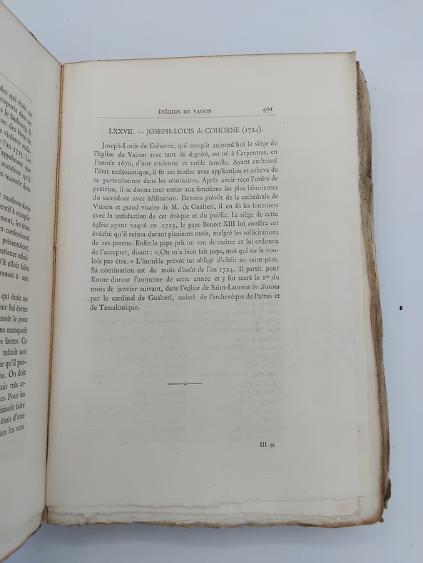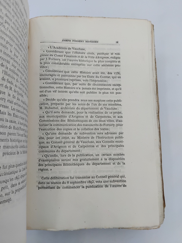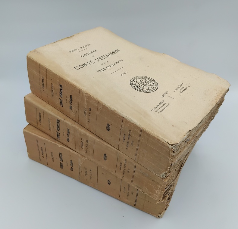 Joseph Fornery – Histoire du Comté Venaissin et de la Ville d’Avignon 3 forts in-8 brochés. François Seguin J. Roumanille, 1909, Avignon. Un portrait en NB en frontispice du premier volume, complet de la carte dépliante du Comté Venaissin dans le troisième volume. Un des 75 exemplaires numérotés (73) sur papier de Hollande du tirage de tête ! Relatif bon état, intérieur frais et propre, non coupé, malgré des piqures et des rousseurs assez discrètes, brochage un peu fragile, un cahier bruni dans le deuxième volume, couvertures assez défraîchies mais intègres.