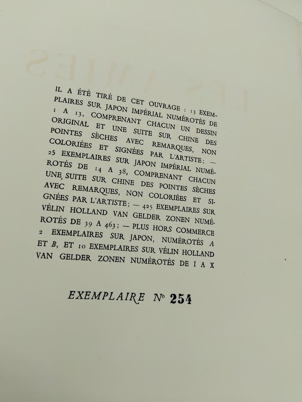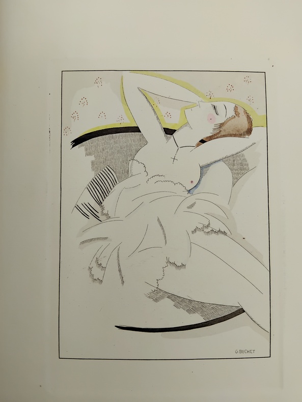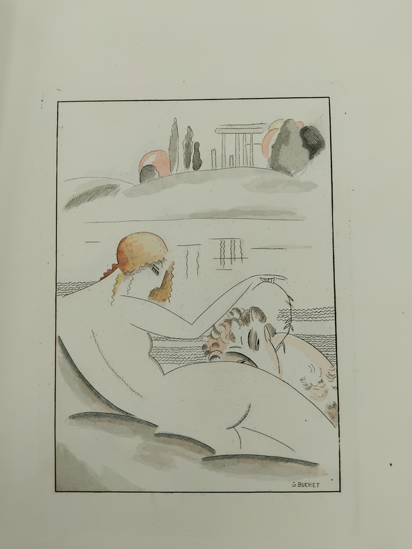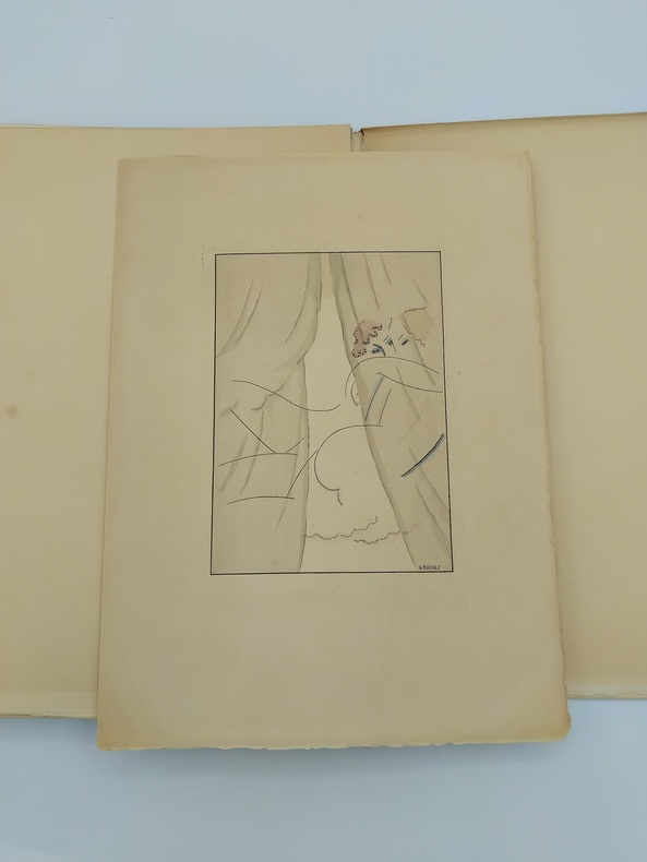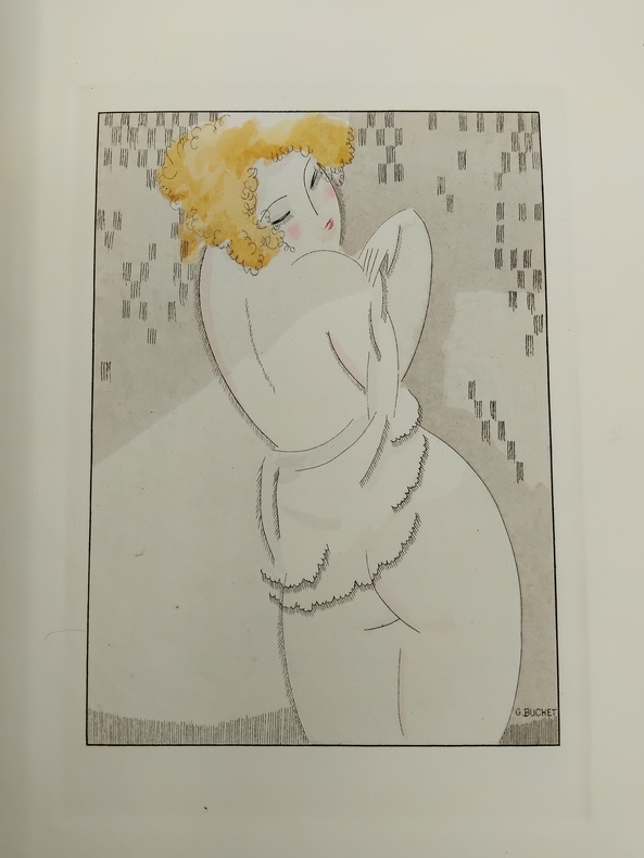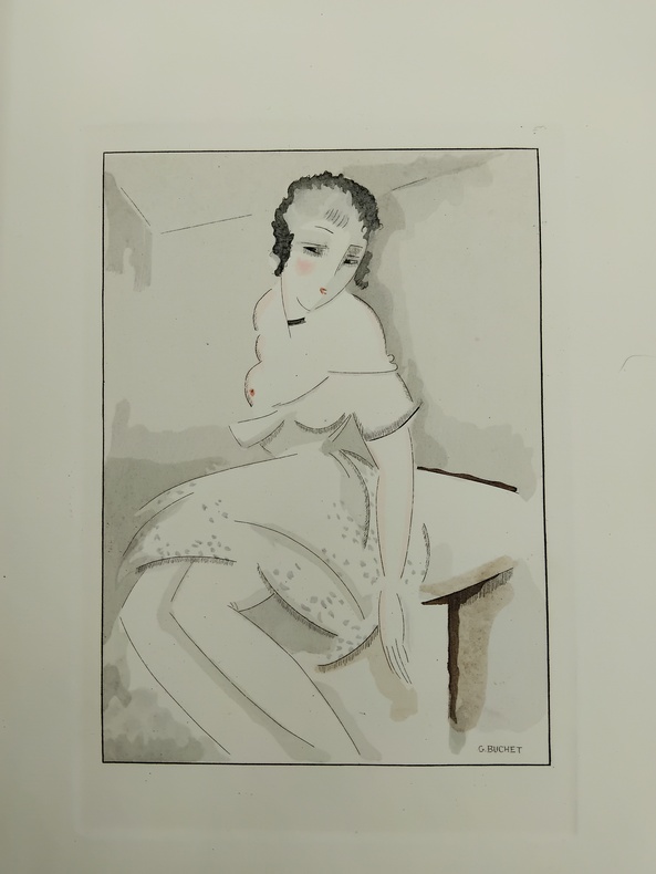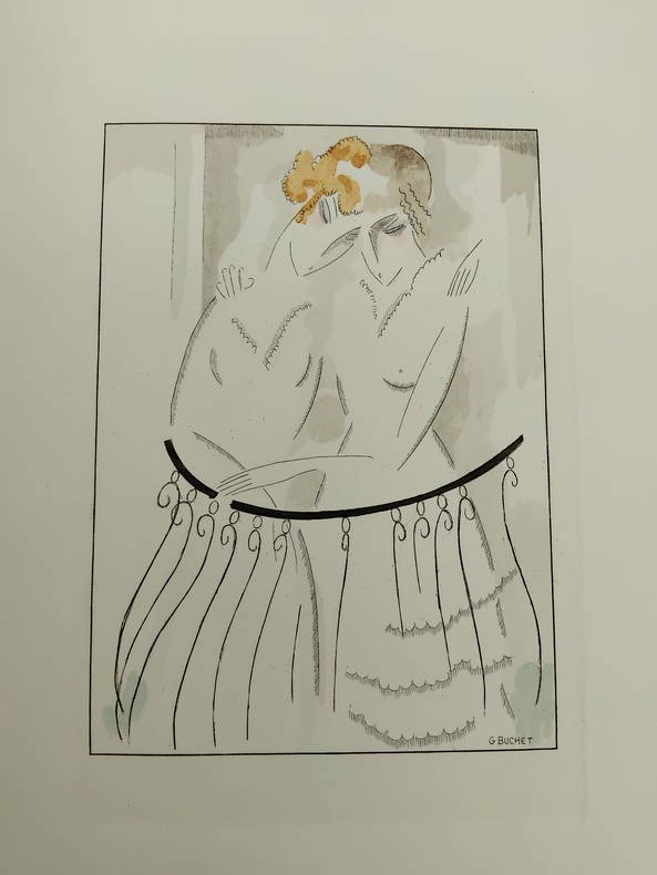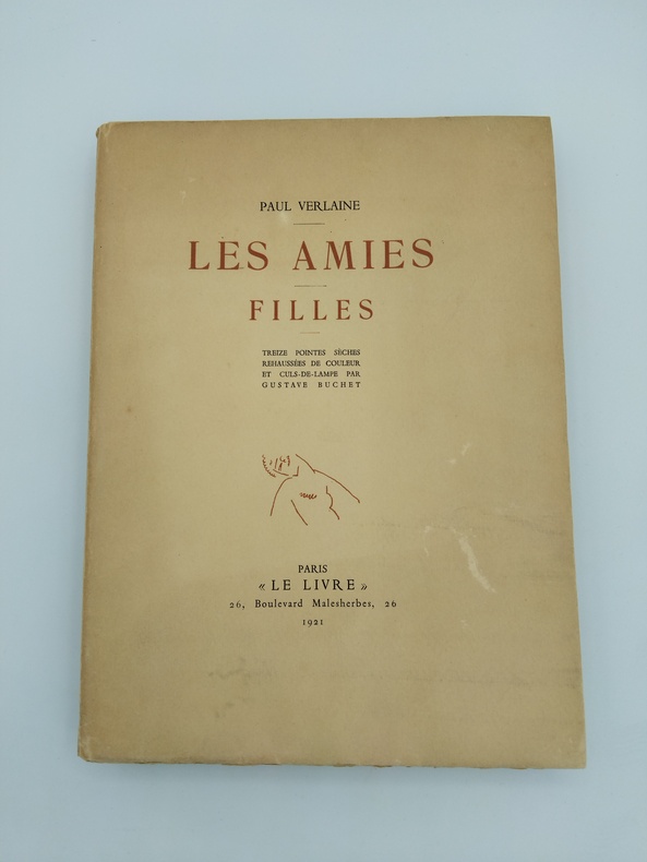 Petit in-4 sous couverture rempliée, feuillets libres. Le Livre, Paris, 1921. L’ouvrage comprend 13 pointes-sèches hors-texte sous serpentes, rehaussées d'aquarelle, et 13 culs-de-lampe en sanguine par Gustave Buchet. Tiré à 475 exemplaires, ici un des 425 exemplaires sur Holland Ven Gelder. Ce volume a été achevé d'imprimer le 20 janvier 1921 par le maître imprimeur Frazier-Soye et enluminé par J. Saudé pour la Société "Le Livre". Bon état général, couverture un peu défraîchie, un peu brunie, coiffes un peu enfoncées présentant de légères traces d’usure et de menues fissures, intérieur frais et propre, complet des illustrations et de ses serpentes. L’exemplaire comprend une illustration supplémentaire sur feuillet libre, placée in fine. Les illustrations d’inspiration cubiste de Gustave Bouchet sont pour beaucoup dans la réussite de cette publication d’inspiration saphique, synthétisant assez bien l’air du temps, mélange de transgression, de goût et d’esthétique (Victor Margueritte publiera la Garçonne l’année suivante). Le texte de Verlaine est porté à la grâce par les vues plastiques, douces et intimistes, du peintre d’origine helvétique Gustave Bouchet (1888-1963) qui trouve ici un sujet inspirant et inspiré, contribuant très amplement à la réussite bibliophilique de cette belle publication.