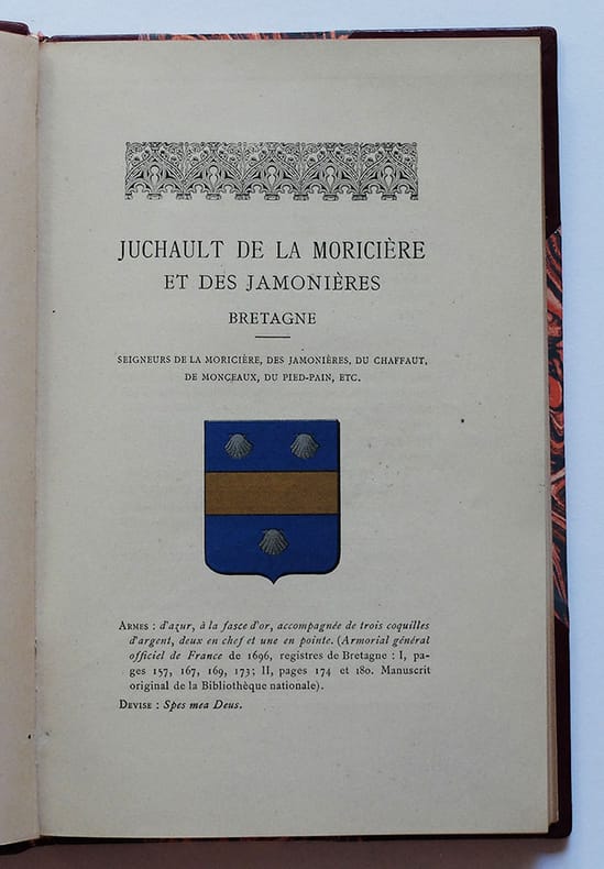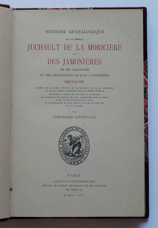 Paris, Cabinet de l'Historiographe (Recueil de Notices historiques sur les familles), 1896. 1 vol. in-8, (25,5 x 16,5 cm) ; [2] ff., 129 pp. Reliure postérieure pastiche en demi-basane bordeaux à coins, dos à nerfs orné, auteur et titre dorés, tête rouge. Couvertures conservées. Traces de scotch sur les deux plats de couvertures d'origine.