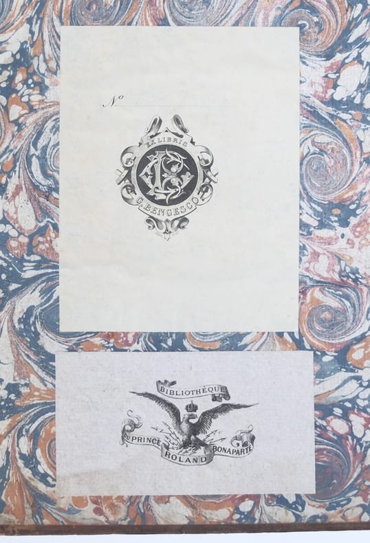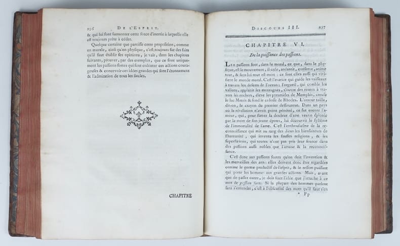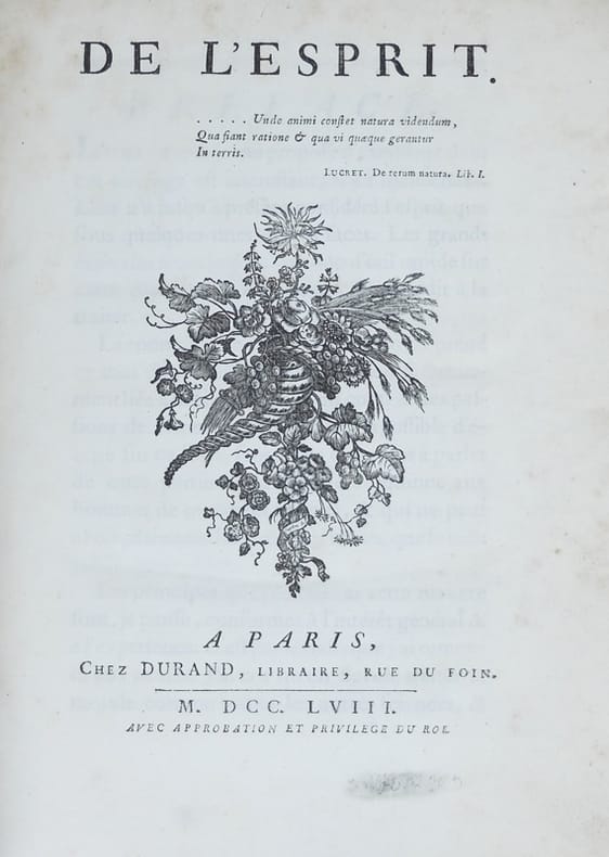 Un monument des Lumières et de la philosophie matérialiste et un des grands scandales éditoriaux du XVIIIe siècle. Édition originale en second tirage (décrite [E.1B] par David Smith), dans lequel le premier mot de la page 5 est "de" (alors qu'il est "dans" dans le premier tirage [E.1A] devenu rarissime et "mon" dans la deuxième édition [E.2] parue la même année et plus commune) et portant les erreurs de titre "Dicours II" au lieu de "Discours II" en tête de la page 67 et "Discours II" au lieu de "Discours III" en tête de la page 295. Ouvrage imprimé par Moreau, imprimeur de la Reine et de monseigneur le Dauphin. À la page 644, comme au premier tirage [E.1A], l'Approbation est signée par Tercier à la date du 27 mars 1758 et le Privilège du roi est signé par Le Bègue au 12 mai 1758, avec un enregistrement par Le Mercier le 19 mai 1758. "Première édition de cet ouvrage célèbre, censuré par la Sorbonne comme contenant tous les poisons épars dans les différents livres modernes, c'est-à-dire contemporains. [...] L'ouvrage dédié à la famille royale, fut repoussé par cette dernière, et le 10 août, peu de jours après celui de la parution, le privilège, donné le 12 mai, fut révoqué. Malgré la Lettre au révérend père..... [Berthier ou Pleix], qui constitue une apologie et une rétractation, suivie d'une autre rétractation plus explicite, le livre fut blâmé par le clergé. Helvétius en remit alors une troisième à Joly de Fleury, avocat général, le 22 janvier 1759 ; le 31 parut la lettre du pape, le 9 avril, la censure de la Faculté de Théologie. Dès le 23 janvier Fleury avait prononcé ses réquisitions, tout en ménageant l'auteur lui-même, et le Parlement, le 6 février 1759 rendit son jugement ; le livre fut brûlé le 10. Helvétius se défit de sa charge de maître d'hôtel de la reine ; le censeur démissionna". (Tchémerzine, Bibliographie des éditions originales et rares d'auteurs français). Table sommaire : Discours I : De l'Esprit en lui-même. Discours II : De l'Esprit par rapport à la société. Discours III : Si l'Esprit doit être considéré comme un don de la nature, ou comme un effet de l'éducation. Discours IV : Des différents noms donnés à l'Esprit. Exemplaire portant deux ex-libris contrecollés au premier contreplat : "Ex-libris G. Bengesco" et "Bibliothèque du Prince Roland Bonaparte". Georges Bengesco (1848-1922) était un diplomate roumain en poste à Paris et bibliographe spécialiste de Voltaire. On lui doit une très bonne Bibliographie franco-roumaine du XIXe siècle (Bruxelles, Paul Lacomblez, 1895). Roland Bonaparte (1858-1924) était géographe, géologue, spéléologue et botaniste. Petit-fils de Lucien Bonaparte et petit-neveu de Napoléon Ier, il avait constitué une très importante bibliothèque. Double bonne provenance pour cet exemplaire. Quelques annotations manuscrites dans les marges. Bibliographie : David Smith, Bibliography of the writings of Helvétius, Centre international d'étude du XVIIIe siècle, Ferney-Voltaire, 2001.