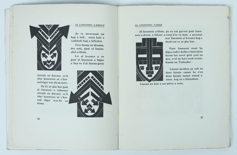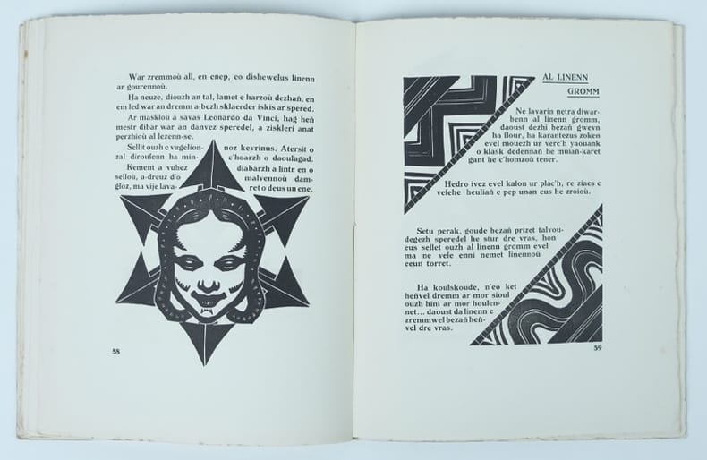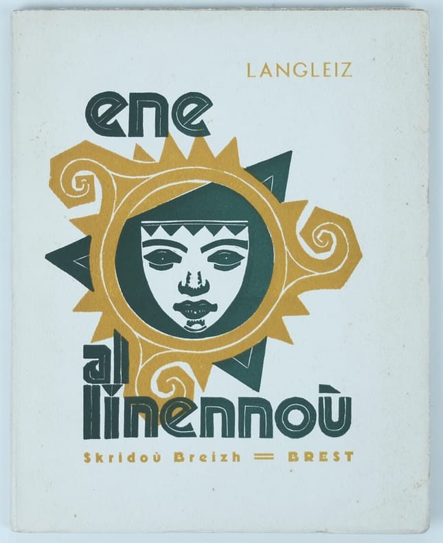 Traité artistique de la ligne par Xavier de Langlais. Tirage limité à 310 exemplaires. Un des 200 exemplaires sur Alfax-Navarre (n° 184). Xavier de Langlais expose ici, en langue bretonne, ses idées sur l'art et surtout sur les lignes dans l'art, leur signification, leur utilisation, leur fonction. Le corps du texte est illustré de 62 figures en noir (bois gravés). Les couvertures, la page de titre et la dernière page sont illustrés en couleurs (vert et jaune). "Très différente est la démarche de Xavier de Langlais qui illustre lui-même son Ene al linennoù (l'Âme des lignes) où la géométrie esthétique et la recherche du Nombre d'Or s'expriment pour la première fois dans une langue insolite." (Yann-Ber Piriou, In. "Les Seiz Breur et la littérature...", Ar Seiz Breur, 1923-1947, la création bretonne entre tradition et modernité, p. 181).