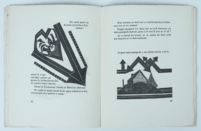Brest, Skridoù Breizh, 1942. 1 vol. in-4, (25,5 x 20 cm) ; 84 pp. et un cahier de [8] pp. in-fine donnant la traduction résumée du texte breton. Broché, couvertures illustrées et rempliées. Quelques piqûres aux couvertures et en début et fin d'ouvrage. Non rogné.