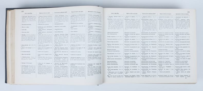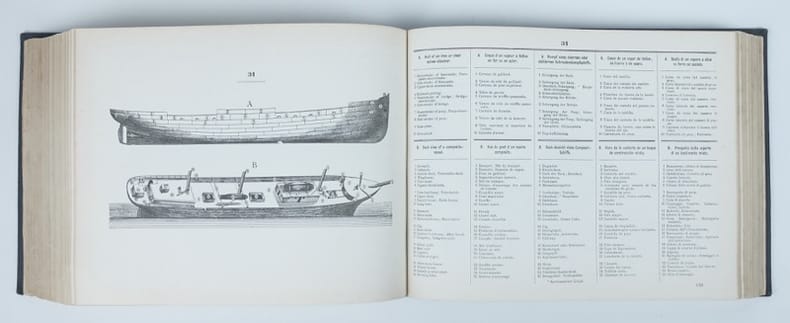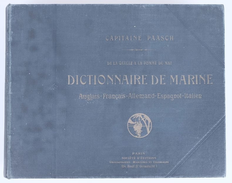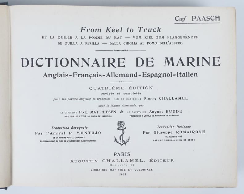 Passionnant dictionnaire de marine en cinq langues. Une référence ! Quatrième édition revisée et complétée pour les parties anglaise et française, par le capitaine Pierre Challamel, pour la langue allemande, par le capitaine F.-E. Matthiesen, directeur de l'école du marin de Hambourg, & le capitaine August Budde, professeur à l'école de navigation de Hambourg. Traduction espagnole par l'Amiral P. Montojo de la Marine royale espagnole, ex-commandant en chef de l'escadre des îles Philippines. Traduction italienne par Giuseppe Romainrone, traducteur juré près le tribunal civil de Gênes. Les 109 planches sont richement légendées en regard dans les cinq langues.