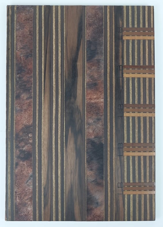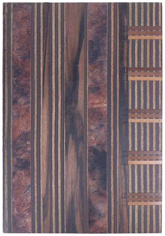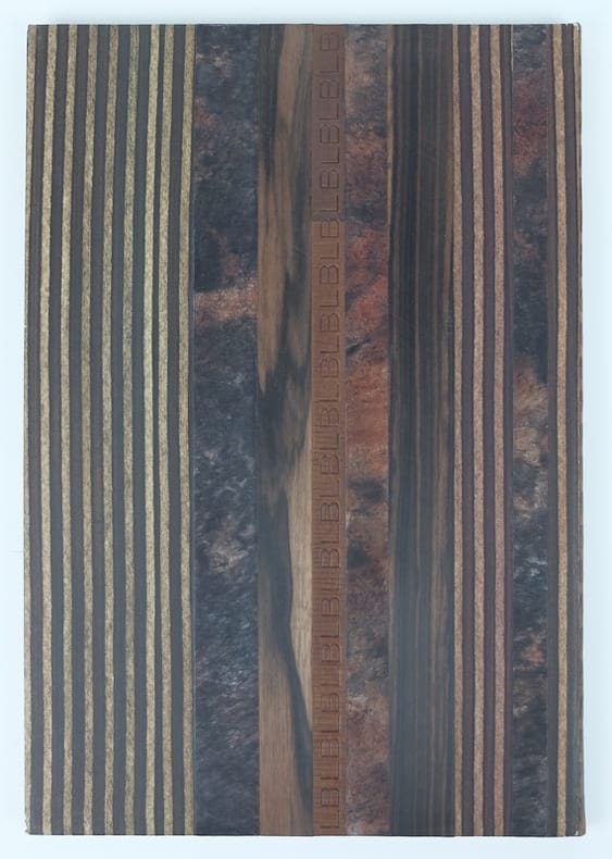 Romillé (Ille-et-Vilaine), sur les presses de l'atelier Folle Avoine, 1984. 1 vol. in-folio, (38 x 26 cm) ; titre et [20] ff. Reliure d'artiste faite de deux plats couverts de papier brun clair à bandes brunes plus foncées et orné de bandelettes verticales de cuir imitant la pierre et le bois, avec sur deux d'entre elles les initiales répétées "LB" du nom de l'auteur. Au bord du premier plat, la composition est coupée par cinq fois trois fines bandelettes horizontales en trois tons de bruns, avec sur l'une le nom de l'auteur et le titre à froid. Le dos, lisse et muet, est couvert d'une alternance de fines bandelettes horizontales en trois tons de bruns. Excellent état.