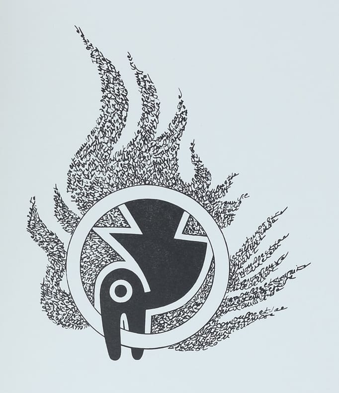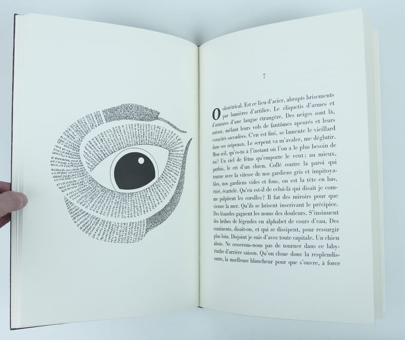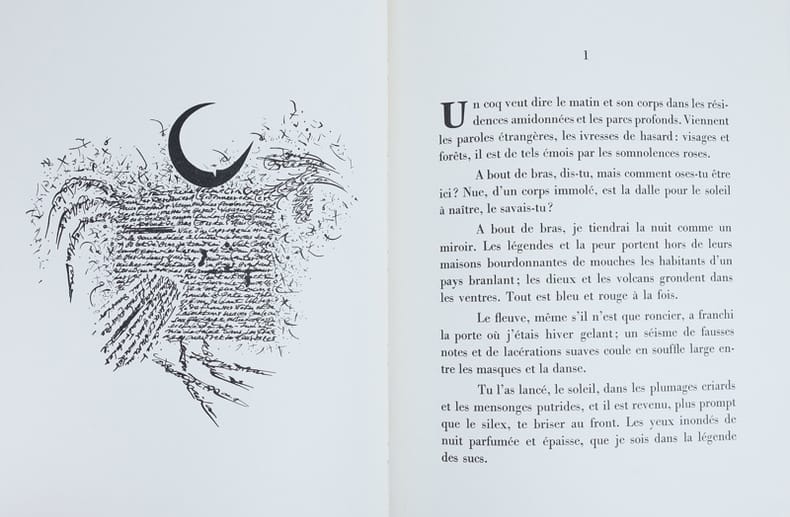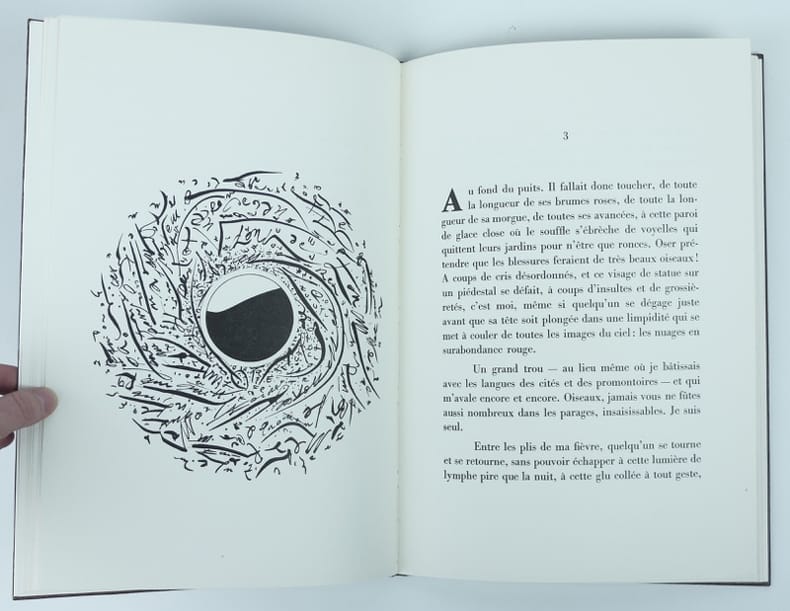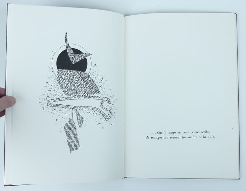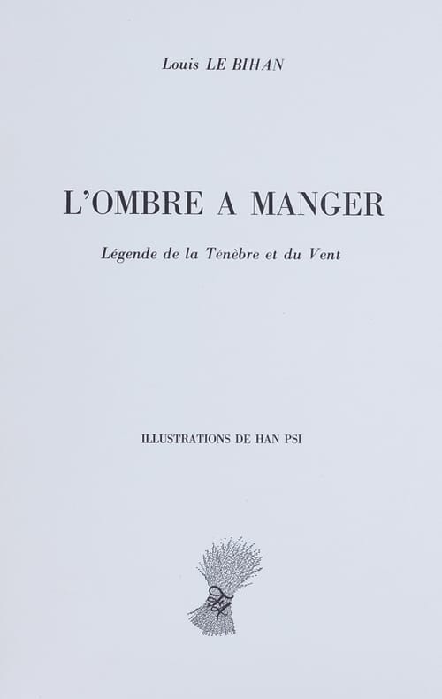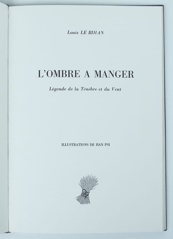 "Car le temps est venu, vieux scribe, de manger ton ombre ; ton ombre et la nuit." Ouvrage publié avec le concours du Conseil régional de Bretagne. Huit chapitres, dont le dernier est daté du 10 octobre 1981 à Grâce, illustrés de dix compositions en noir et à pleine page de l'artiste rennais Han Psi (1933-2015). La Maison du Livre de Bécherel a présenté en 2021 une exposition rétrospective des œuvres de Han Psi, de son vrai nom Michel Collin, typographe de formation. La reliure, non signée, est l'œuvre d'Emma Coll, relieur d'art autrefois établie à Dinan.