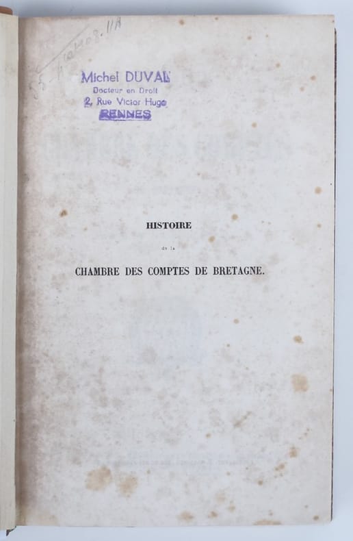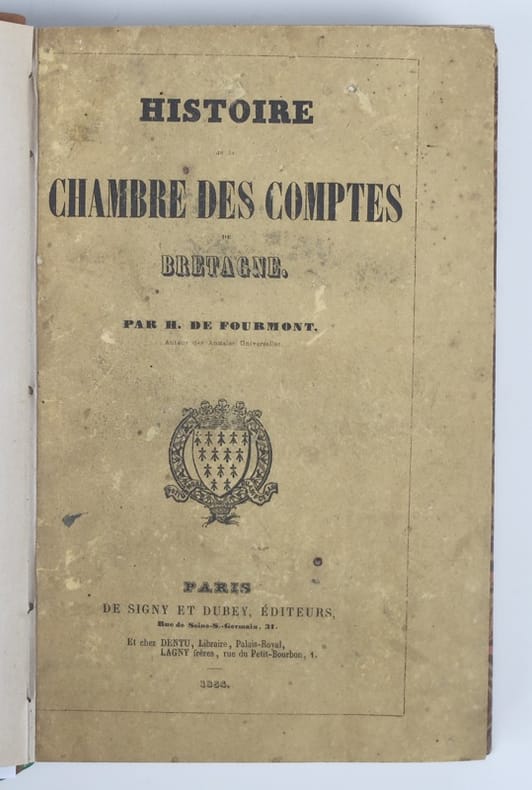 Édition originale. Exemplaire de l'historien rennais Michel Duval, avec son tampon. Hyacinthe de Fourmont était l'auteur des Annales universelles contenant l'histoire du monde de la création à Jésus-Christ, parues en 1848 (Nantes, Guéraud et Hachette).