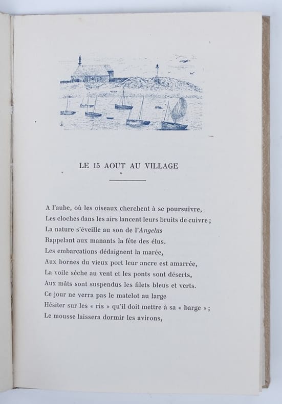 Avec onze illustrations de l'auteur, en camaïeu de bleu, placées en tête de chaque poème : Prologue, La Presqu'île, La Salle Verte, Le 15 Août au Village, Les Fiancés, La Toussaint chez les Marins, Les Vieux, Le Hameau, Le Vieux Manoir, Fanchette, Le Sort du Marin. Ouvrage rare, mentionné dans la Bibliographie bretonne d'André Lesort pour l'année 1908 (Annales de Bretagne et des Pays de l'Ouest, t. 25, n° 3, 1909, p. 580, n° 164). Bel exemplaire, en partie non coupé.