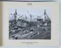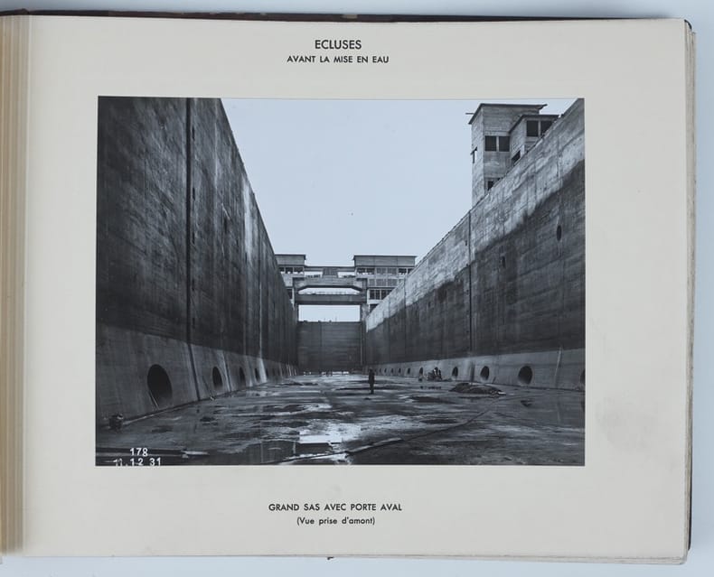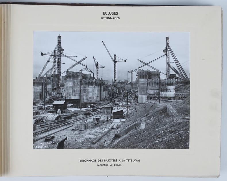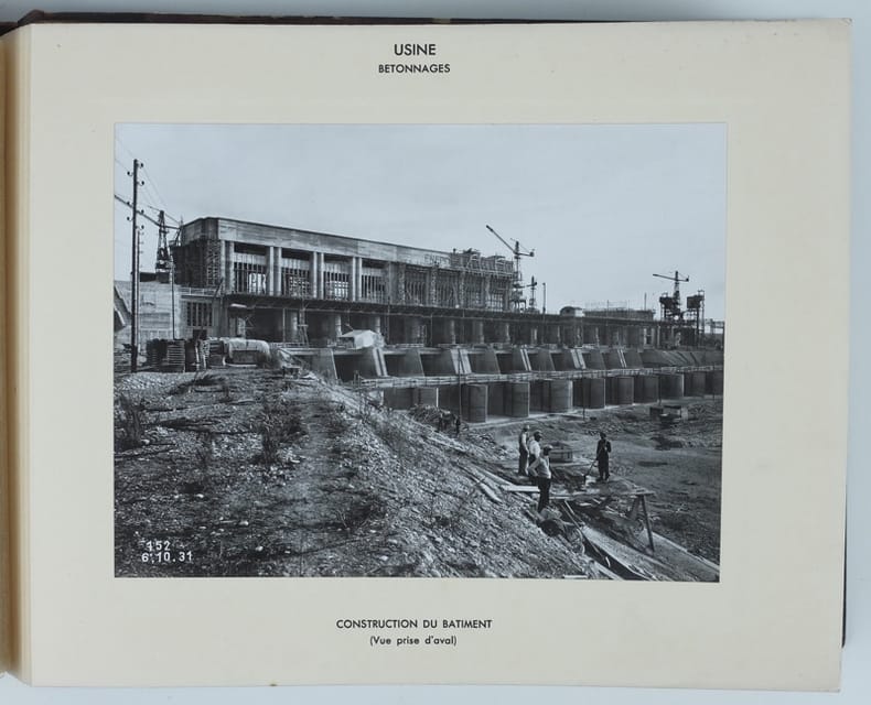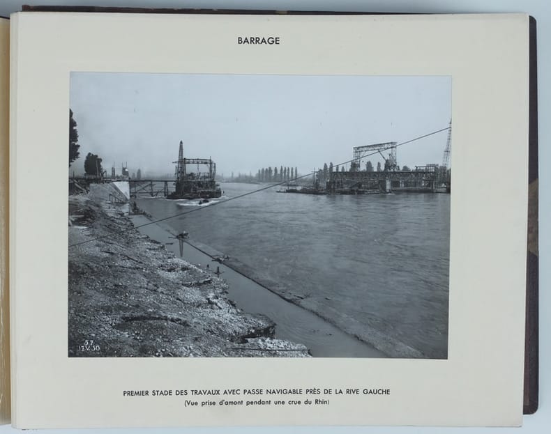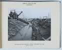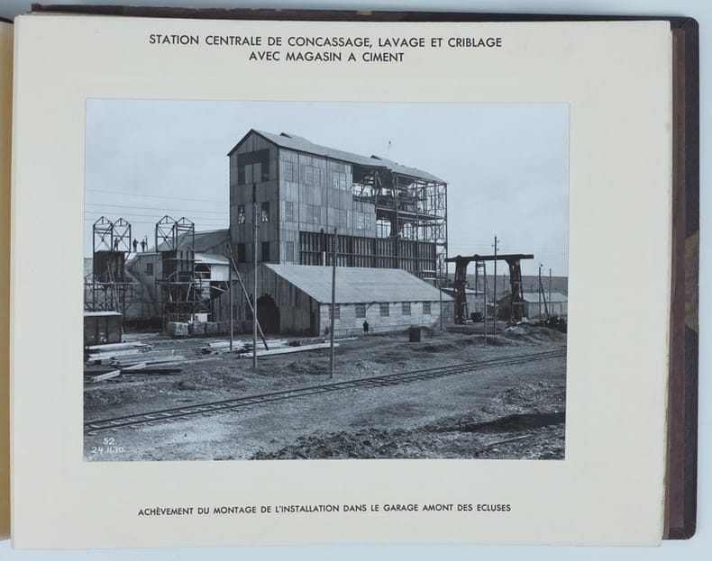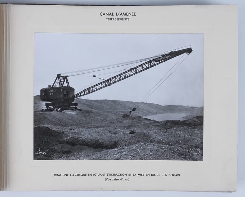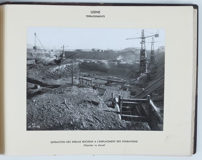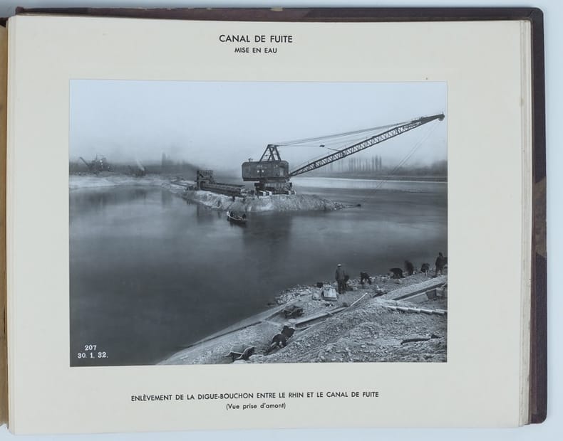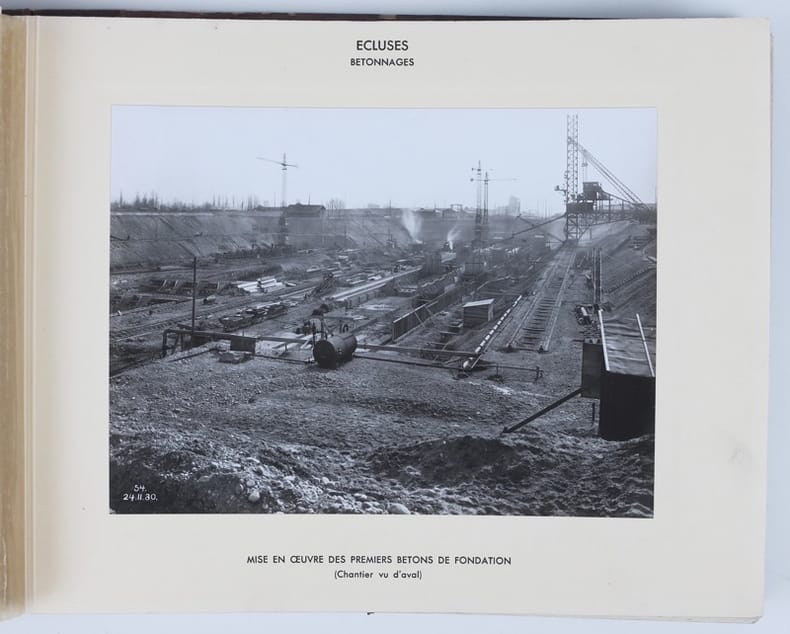 Tirages argentiques noir et blanc de belle qualité. Les photographies sont contrecollées sur les feuillets de papier fort de l’album, avec légendes imprimées, et sont toutes protégées par des serpentes. Chaque tirage est numéroté et daté. Rare témoignage souvenir de la première étape de la construction du grand canal d’Alsace à Kembs, avec ses écluses et sa centrale hydroélectrique. Les photographies montrent différentes étapes du chantier, qui a eu lieu de 1929 à 1932. Ce projet d’envergure a permis d’améliorer la navigabilité du Rhin et la liaison de la Suisse à la mer du Nord. 1. Canal d’amenée, terrassements. Dragline électrique effectuant l’extraction et la mise en digue des déblais (Vue prise d’aval). 3-24.IV.29. 2. Canal d’amenée, revêtements des talus. Machine réglant les talus à 3 :1 dans une section normale du canal, avant le bétonnage du revêtement (Vue prise de l’aval). 113-25.3.31. 3. Canal d’amenée, revêtements des talus. Machine bétonnant un talus à 2 :1 dans la partie aval du canal d’amenée (Vue prise d’amont, à proximité de l’Usine). 63-17.V.30. 4. Écluses, terrassements. Pelles à vapeur creusant les fouilles dans les alluvions recouvrant le rocher de fondation (Chantier vu d’aval). 13-7.V.29. 5. Écluses, terrassements. Achèvement des fouilles dans le rocher avant le bétonnage (Chantier vu d’amont). 33-27.IX.29. 6. Écluses, bétonnages. Mise en œuvre des premiers bétons de fondation (Chantier vu d’aval). 54-24.II.30. 7. Écluses, bétonnages. Vue d’ensemble des installations de bétonnage (Chantier vu d’aval). 62-17.V.30. 8. Écluses, bétonnages. Bétonnage des bajoyers à la tête aval (Chantier vu d’aval). 78-19.VIII.30. 9. Écluses, bétonnages. Construction des superstructures en béton armé à la tête aval (Chantier vu d’aval). 109-25.3.31. 10. Écluses, avant la mise en eau. Vue d’ensemble de la tête aval. 176-11.12.31. 11. Écluses, avant la mise en eau. Grand sas avec porte aval (Vue prise d’amont). 178-11.12.31. 12. Usine et canal de fuite, terrassements. Excavateur électrique amorçant la fouille à l’emplacement de l’usine (Chantier vu d’aval). 6-24.IV.29. 13. Usine et canal de fuite, terrassements. Ripeuse déplaçant les voies de l’excavateur (Chantier vu d’aval). 27-16.VII.29. 14. Usine et canal de fuite, terrassements. Excavateur électrique creusant le canal de fuite dans les alluvions (Chantier vu d’aval). 35-27.IX.29. 15. Usine, terrassements. Extraction des déblais rocheux à l’emplacement des fondations (Chantier vu d’aval). 45-21.XII.29. 16. Usine, bétonnages. Mise en œuvre des premiers bétons de fondation (Chantier vu d’aval). 64-17.V.30. 17. Usine, bétonnages. Bétonnage du radier aval et des tuyaux d’aspiration des turbines (Vue prise de l’extrémité Est du chantier). 71-19.VIII.30. 18. Usine, bétonnages. Vue d’ensemble des installations de bétonnage et des groupes en construction (Vue prise de l’extrémité Est du chantier). 106-25.3.31 (photo verticale). 19. Usine, bétonnages. Construction du bâtiment (Vue prise d’aval). 152-6.10.31. 20. Usine, avant la mise en eau. Vue d’ensemble prise d’amont. 181-11.12.31. 21. Usine, écluses, garage aval et canal de fuite, avant la mise en eau. Vue d’ensemble prise de la rive gauche du canal de fuite. 183-11.12.31. 22. Canal de fuite, mise en eau. Enlèvement de la digue-bouchon entre le Rhin et le canal de fuite (Vue prise d’amont). 207-30.1.32. 23. Station centrale de concassage, lavage et criblage avec magasin à ciment. Achèvement du montage de l’installation dans le garage amont des écluses. 52-24.11.30. 24. Barrage. Vue d’ensemble au début des travaux (Chantier vu de la rive gauche du Rhin). 9-7.V.29. 25. Barrage. Premier stade des travaux avec passe navigable près de la rive gauche (Vue prise d’amont pendant une crue du Rhin). 57-17.V.30. 26. Barrage. Deuxième stade des travaux avec passe navigable reportée vers la rive droite (Vue prise d’amont). 142-6.10.31.