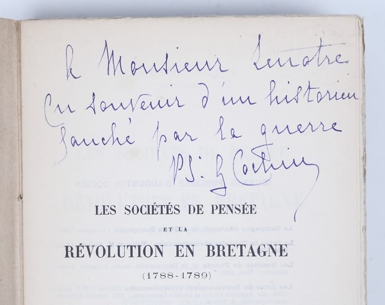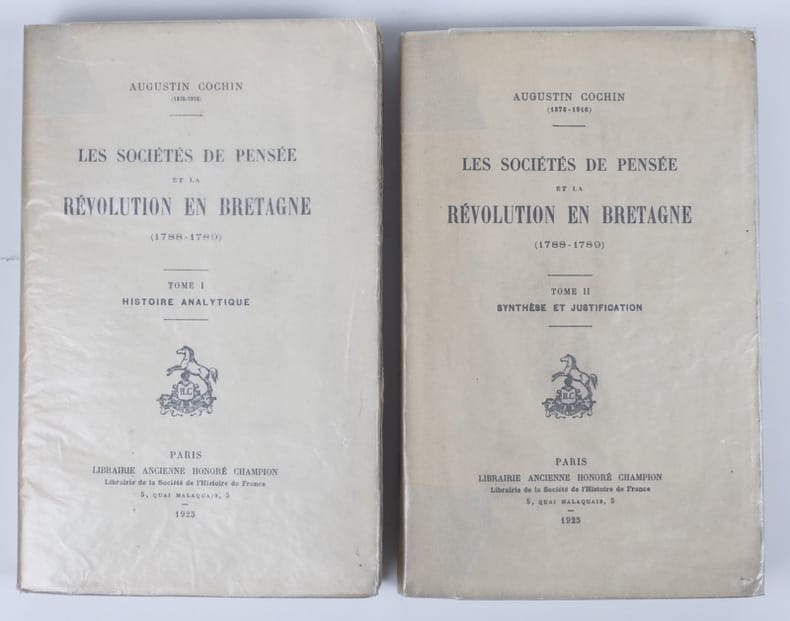 Tome 1, Histoire analytique : Les Sociétés en pensée. – Les sociétés de Bretagne. – La journée du 10 mai. – La propagande. – La journée du 2 juin. – La machine. – Les députations. – La conquête de la Province. – Premiers signes de scission. – La déroute du Bastion. – La formation de la nouvelle Machine. – L'assemblée de Rennes. – Les États provinciaux. – Les deux machines. – Le plan Target et les villes. – Le plan Target et les campagnes. – Les émeutes des 26 et 27 janvier. – Le triomphe du patriotisme. – Les élections. – Les élections à Rennes et à Nantes. Tome 2, Synthèse et justification : Le centre. – La circonférence. – Pièces justificatives. Seul le début de l'ouvrage a été lu : le tome 1 est coupé jusqu'à la page 256 seulement et le tome 2 est entièrement non coupé. Ex-dono au faux-titre du tome 1 : exemplaire offert par un membre de la famille de l'auteur à Monsieur Lenotre, "en souvenir d'un historien fauché par la guerre" (Augustin Cochin est mort en 1916 lors de la Bataille de la Somme). Il s'agit probablement de l'exemplaire de l'historien Théodore Gosselin, dit G. Lenotre.