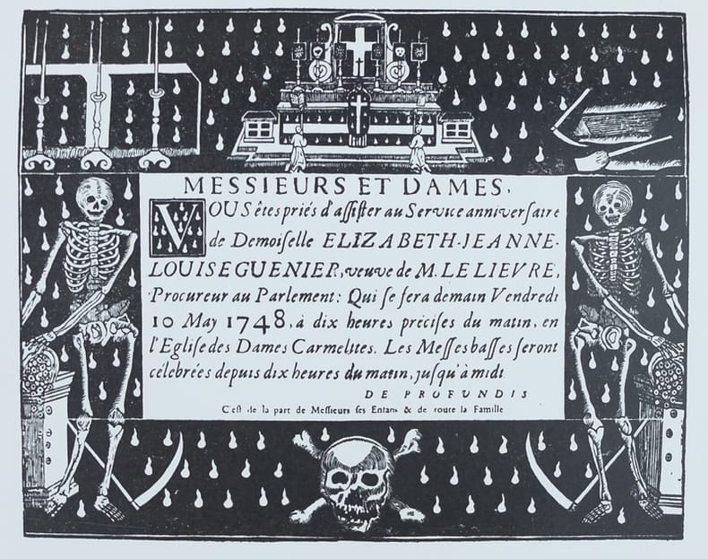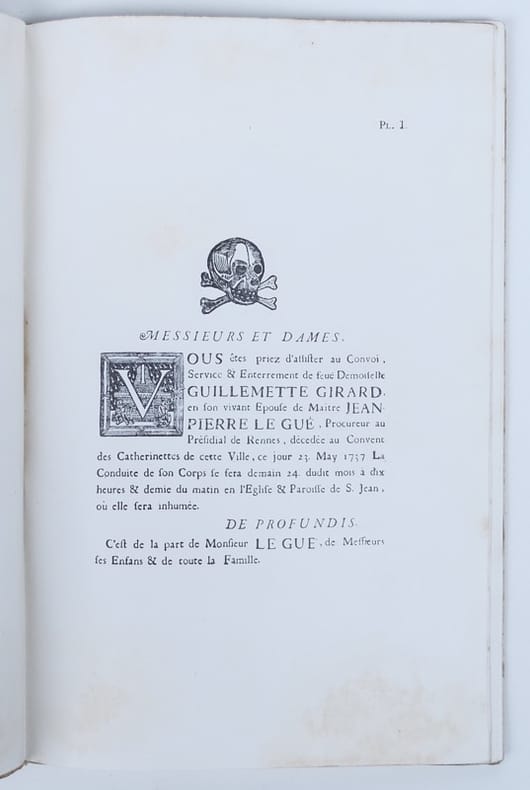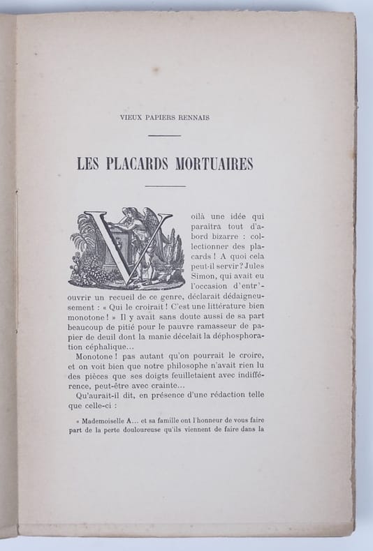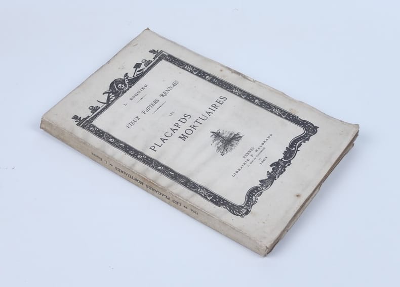 Extrait du tome XXXIII des Mémoires de la Société archéologique d'Ille-et-Vilaine. Intéressantes études sur les placards mortuaires rennais, avec une nomenclature de 125 placards, divisés en 41 variétés et allant de 1736 à 1853. Ornements macabres dans le texte et 25 planches hors texte de fac-similés in-fine.