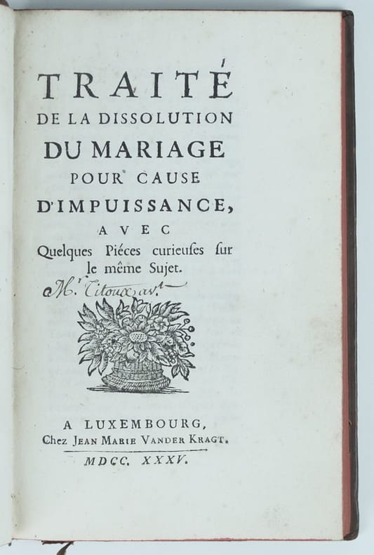 Édition originale publiée sans le nom de l'auteur. Traité en deux parties : Traité sur la manière de procéder dans les instances en dissolution de mariage, pour fait d'impuissance, et Traité des procédures, qui sont en usage en France pour la preuve de l'impuissance de l'homme. Les deux pièces curieuses annoncées au titre sont le Factum d'Estienne Pasquier pour Damoiselle Marie de Corbie, demanderesse en déclaration de nullité de mariage, contre Maître Estienne de Bray, défendeur, et la Relation de ce qui s'est passé au sujet de la dissolution du mariage de Charles de Quellenec, Baron du Pont, avec Catherine de Parthenay, fille du Sr. de Soubise. Barbier, IV, 755 ; Brunet, V, 917. Ex-libris manuscrit à la page de titre : "M. Titoux av[oca]t".