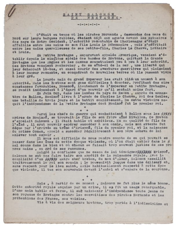 Ce tapuscrit est un projet de cycle hagiographique breton, relatant les vies de plusieurs saints bretons : Saint Salomon de Bretagne (3 ff.), Saint Hervé (2 ff.), Saint Tanguy et sainte Haude (3 ff.), Sainte Noyale (3 ff.), Saint Kado (3 ff.) et Saint Judicael roi de Domnonée (2 ff.). Ces vies des saints de Bretagne, rédigées dans un style moderne, fluide et narratif, semblent n’avoir jamais été publiées. Fañch Élès, dit Abeozen (1896-1963), dont l’attribution de ce tapuscrit est donnée sur la couverture, était un écrivain breton, natif du Finistère, auteur de romans et de pièces de théâtre en langue bretonne. Il fut mobilisé pendant la Première Guerre mondiale et fut emprisonné après la seconde, accusé de collaboration. S’il ne fut pas lourdement condamné, il fut tout de même interdit d’enseigner et de résider en Bretagne. Il a écrit dans les revues et journaux Gwalarn, War Sao, Feiz ha Breiz, La Bretagne, L'Heure Bretonne, Arvor… Membre des Seiz Breur et de l’Institut celtique de Bretagne, il a été publié notamment par les éditions Skridoù Breizh. Par son œuvre littéraire et ses travaux linguistiques, Abeozen joua un rôle majeur dans le renouveau littéraire breton du XX siècle et contribua activement à la modernisation de la langue bretonne.