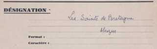 [Vers 1930-1940]. Tapuscrit original et inédit de 16 feuillets maintenus ensemble par un trombone (rouillé), sous une couverture d’imprimeur avec les champs imprimés – N°, Date, Client, Adresse, Désignation, Papier, Impression, Reliure, Observations – restés vierges à l’exception de la désignation : « Les Saints de Bretagne » et « Abeozen ». Quelques corrections manuscrites.