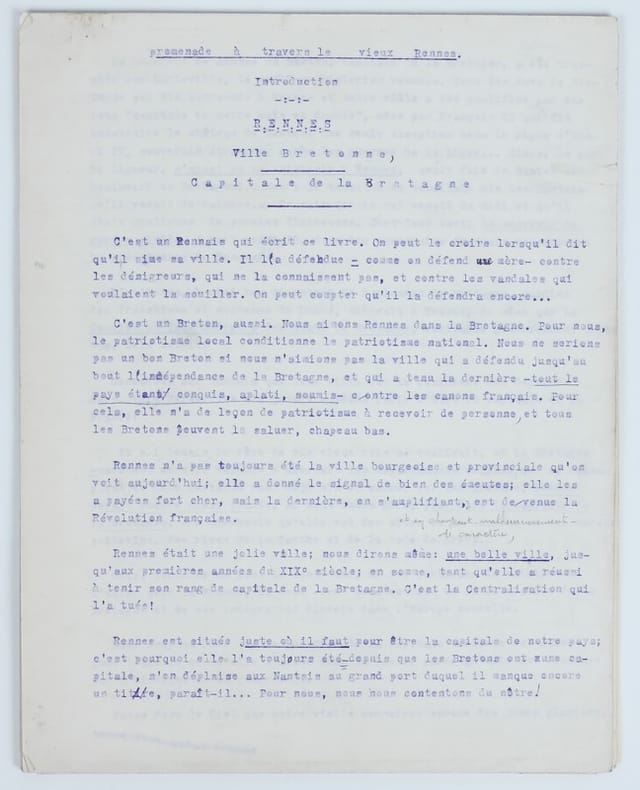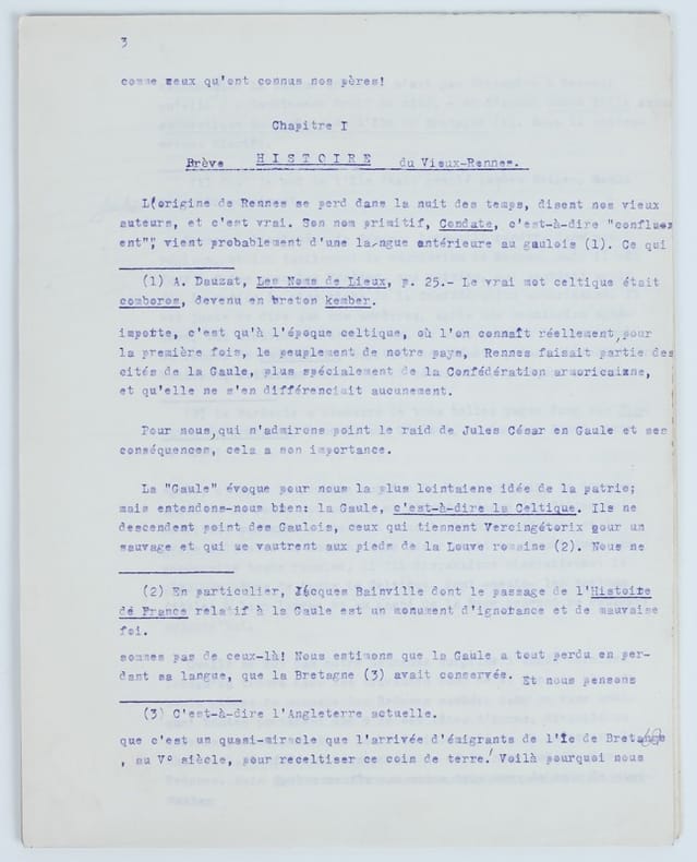 L’auteur anonyme, patriote rennais convaincu et partisan de la Bretagne libre, fournit un texte plutôt militant qu’une œuvre d’historien. Il pourrait être un membre de la mouvance PNB / Breiz Atao (peut-être Morvan Marchal ?). Il défend dans son introduction la place de Rennes comme capitale de la Bretagne, introduction que nous retranscrivons ici dans son entièreté. Introduction (ff. 1-3) : Rennes, Ville bretonne, Capitale de la Bretagne. « C'est un Rennais qui écrit ce livre. On peut le croire lorsqu'il dit qu'il aime sa ville. Il l'a défendue comme on défend une mère contre les dénigreurs, qui ne la connaissent pas, et contre les vandales qui veulent la souiller. On peut compter qu'il la défendra encore... C’est un Breton, aussi. Nous aimons Rennes dans la Bretagne. Pour nous, le patriotisme local conditionne le patriotisme national. Nous ne serions pas un bon Breton si nous n’aimions pas la ville qui a défendu jusqu’au bout l’indépendance de la Bretagne, et qui a tenu la dernière – tout le pays étant conquis, aplati, soumis – contre les canons français. Pour cela, elle n’a de leçon de patriotisme à recevoir de personne, et tous les Bretons peuvent la saluer, chapeau bas. Rennes n’a pas toujours été la ville bourgeoise et provinciale qu’on voit aujourd’hui ; elle a donné le signal de bien des émeutes ; elle les a payées fort cher, mais la dernière, en s’amplifiant, est devenue la Révolution française. Rennes était une jolie ville ; nous dirons même : une belle ville, jusqu’aux dernières années du XIXe siècle ; en somme, tant qu’elle a réussi à tenir son rang de capitale de la Bretagne. C’est la Centralisation qui l’a tuée ! Rennes est située juste où il faut pour être la capitale de notre pays ; c’est pourquoi elle l’a toujours été depuis que les Bretons ont une capitale, n’en déplaise aux Nantais au grand port duquel il manque encore un titre, paraît-il… Pour nous, nous nous contentons du nôtre ! La question de Rennes ou Nantes, capitale de la Bretagne, a d’ailleurs été tranchée par Marteville, le meilleur historien rennais. Tous les ducs de Bretagne ont été couronnés à Rennes et notre ville a été qualifiée par eux tous “capitale de notre païs et duché”, même par François II qui fit construire le château de Nantes ! Une seule exception sous le règne d’Henri IV, souverain étranger, après les guerres de la Ligue… Alors, le parti ligueur, n’ayant pu se maintenir à Rennes, avait fait de Nantes son boulevard en Bretagne… Henri IV tenait à se concilier les Nantais qu’il venait de vaincre. On sait que ce roi venait du Midi et qu’il était prodigue de paroles flatteuses. C’est donc tout : un souvenir de guerre civile. À part cela, tous les souverains français reconnurent la prééminence de Rennes. D’ailleurs, à quoi bon discuter ? Le Parlement de Bretagne, gardien des franchises et coutumes du Duché, siégeait à Rennes, de même que la Commission Intermédiaire des États de Bretagne, véritable gouvernement breton. Cela suffit ! Concédons aux Nantais que leur ville fût la résidence des derniers ducs. Mais Versailles n’a jamais empêché Paris d’être la capitale de la France ! Et si, demain, le rêve de nos vieux rois se réalisait, si la Bretagne – marchant vers le soleil – s’annexait les départements voisins, qui se dépeuplent, et dont certains sont déjà mis en valeur par les Bretons, Rennes serait encore mieux placée, – à mi-chemin qu’elle est des côtes de la Manche et des marais poitevins, des rives de la Sarthe et de la rade de Brest. Cela, personne ne peut le contester, ni les partisans du maintien de l’union avec la France, ni ceux – dont nous sommes – de la libération de la Bretagne et de son intégration directe dans l’Europe nouvelle. Nous croyons donc que la question de la capitale bretonne est fixée pour l’avenir, comme elle l’a été dans le passé, parce qu’elle est dessinée par l’histoire et la géographie. Fasse donc le Ciel que notre ville connaisse encore des jours glorieux, comme ceux qu’ont connus nos pères ! » Chapitre I : Brève Histoire du Vieux-Rennes. Feuillets 3 à 25. L’auteur décrit notamment l’héritage gallo-romain de Rennes (tout en le fustigeant), puis l’époque des invasions germaniques et des invasions scandinaves, des premiers rois bretons, Nominoé, Alain Barbetorte, la domination anglaise du XIIe siècle. Il cite des extraits du Livre des Manières d’Étienne de Fougères. « La “Gaule” évoque pour nous la plus lointaine idée de la patrie ; mais entendons-nous bien : la Gaule, c’est-à-dire la Celtique. Ils ne descendent point des Gaulois, ceux qui tiennent Vercingétorix pour un sauvage et qui se vautrent aux pieds de la Louve romaine. Nous ne sommes pas de ceux-là ! Nous estimons que la Gaule a tout perdu en perdant sa langue, que la Bretagne (c’est-à-dire l’Angleterre actuelle) avait conservée. Et nous pensons que c’est un quasi-miracle que l’arrivée d’émigrants de l’île de Bretagne, au V° siècle, pour receltiser ce coin de terre ! Voilà pourquoi nous estimons que la langue bretonne n’est pas étrangère à Rennes ; qu’elle y a doublement droit de cité, – et d’abord comme fille authentique du gaulois de l’île de Bretagne. Nous la retrouverons bientôt. » (Extrait). « Quelle ne fut pas notre heureuse surprise l'année dernière lorsqu'on trouva dans les travaux du camp de St. Jacques plus de cent pièces de monnaie des Redones cachées dans un vase antique ! Toutes portaient une de ces têtes d'homme, divinité ou guerrier, dont a si bien parlé Camille Julian, et au revers le char de la Confédération armoricaine et la roue solaire des Redones. » Cette phrase pourrait renvoyer à la découverte en 1941 d’un important dépôt monétaire sur le site de fouilles de Saint-Jacques-de-La-Lande et nous permet de dater ce t