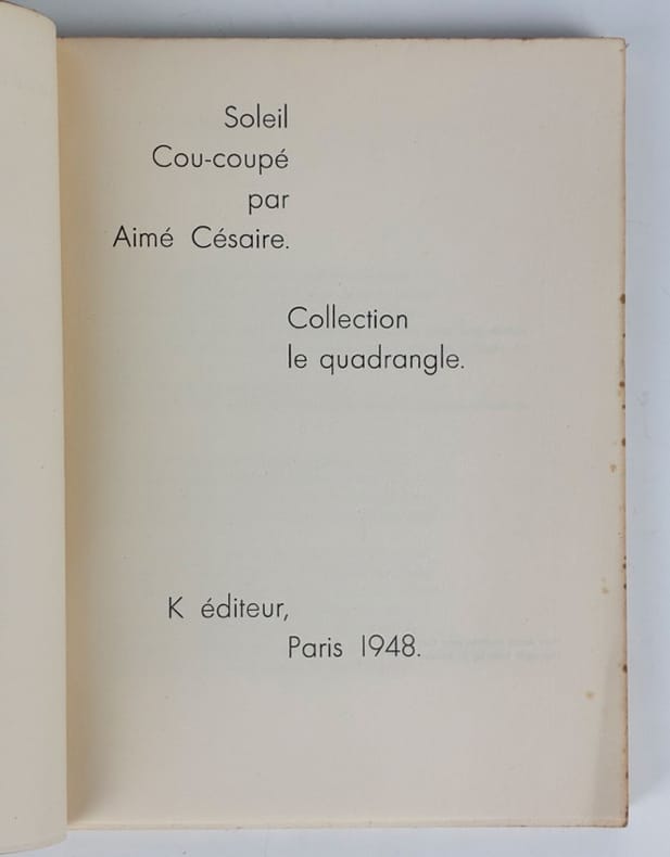 Édition originale de ce recueil de poésies d'Aimé Césaire, au titre repris d'un poème de Guillaume Apollinaire. Tirage à 2050 exemplaires (+ 110 H.C.). Un des 2000 exemplaires sur alfa du Marais (n° 1164). Troisième ouvrage de la collection de poésie "Le Quadrangle", dirigée par Alain Gheerbrant.